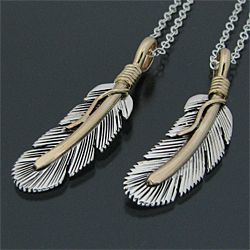 部族NAVAJO/ナバホ族制作者Harvey Maceハーヴィー・メイスホールマーク(刻印)H.MACE素材12KGF(12金張り)スターリングシルバーサイズ表商品説明◎全長:41mm◎縦幅:約33mm◎横幅:約10mm◎厚み:約2mm〜約0.5mm◎チェーンの長さ:約45cm◎重量:約2g(チェーン含まず)サイズは多少前後する場合がございますので、予めご了承下さい。大空高く舞い上がるイーグルは神様に一番近い存在とされています。そのフェザーは、人々の祈りを神様に届ける役割を持ち、様々な場面で用いられます。 NAVAJO/ナバホ族の人気アーティストHarvey Mace/ハーヴィー・メイスが制作したイーグルフェザーモチーフのネックレスです。フェザーのモチーフに、センターの芯部分には12KGF(12金張り)が施されている、とても高級感の感じられる作品に仕上がっています。フェザーのモチーフで有名なベテランアーティストで、躍動感の溢れるフェザーは、シンプルでバランス良くお使い頂けるアイテムです。流行に流されないすっきりとしたシンプルなデザインは、男女問わず幅広い層から支持を得ています。シルバーとゴールドのコンビはスタイリングが締まります。無料にてラッピングサービスを承っております。お客様の大切な贈り物を心を込めてラッピングさせて頂きます。どうぞご利用くださいませ。撮影時の照明等の影響やPCディスプレイの特性の差などで、実物とは色合いが異なって見える場合がありますので、予めご了承下さいますようお願い致します。