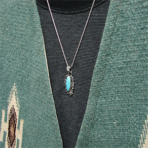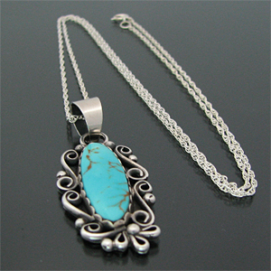 ◎全長:43mm◎縦幅:約30mm◎横幅:約18mm◎石の大きさ:約23mm×約8mm◎厚み:約5mm◎チェーンの長さ:約50cm◎重量:約5g◎素材:キャリコレイク(ターコイズ)・スターリングシルバー