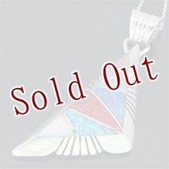 シルバーの板で仕切りを作り、その枠の中へターコイズやシェル、コーラル等の石や貝殻等を細かくカットした物をはめ込んでデザインを作っていくチャンネルインレイを用いて制作されています。