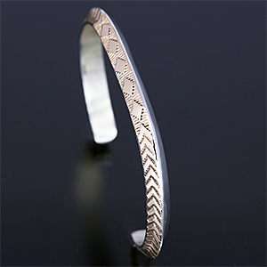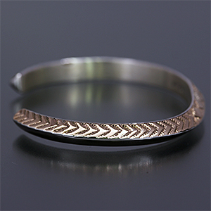 三角形の形状を活かして、14Kゴールド(スタンプ側)、シルバー(プレーン側)と片面ずつ異なった素材を組合わせたコンビバングルになります。