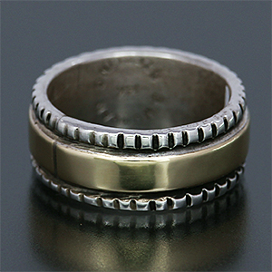 | NAVAJO/ナバホ族のアーティスト Bruce Morgan/ブルース・モーガンに制作依頼をしたリングです。 シルバーに14Kをオーバーレイさせたブルースの代表的スタイルの作品です。デザインは伝統的スタイルのチゼルワークと呼ばれるタガネ(鉄の先を鋭く削ったノミ、彫刻刀のようなもの)を用いて仕上げられています。 普段アクセサリーを着けられていない方でも安心してスタイルをお楽しみ頂けます。 | ||