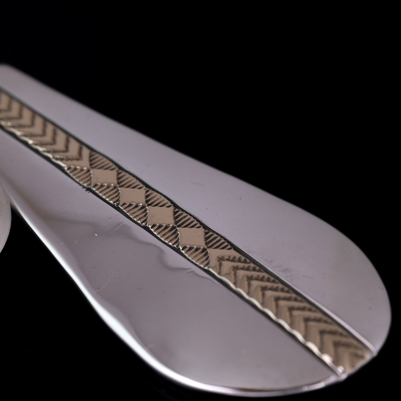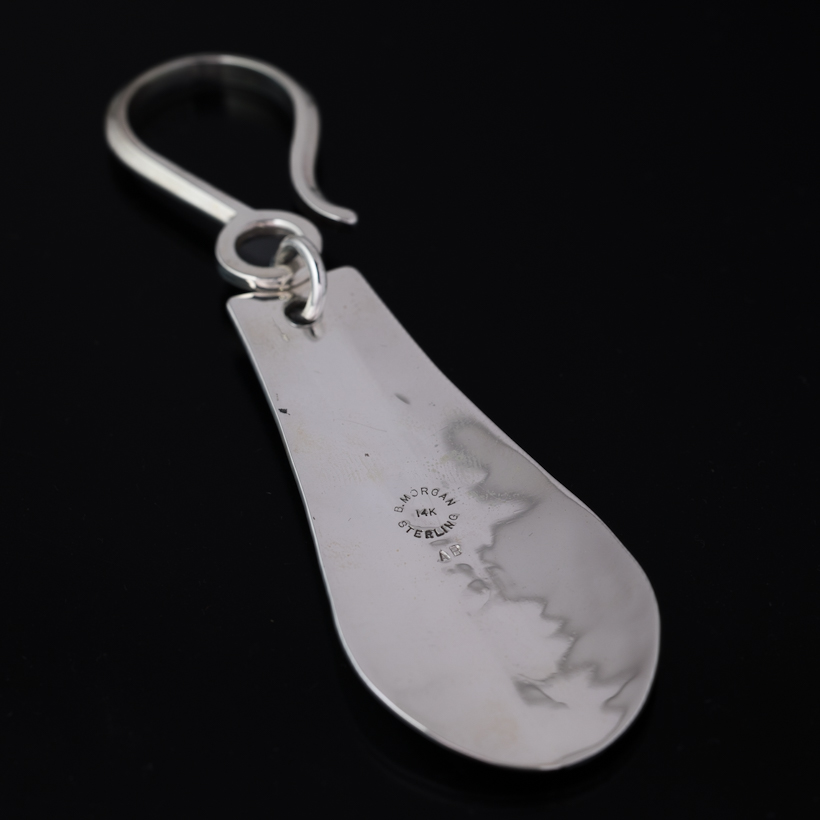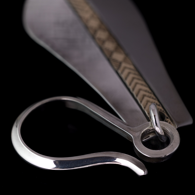 | NAVAJO/ナバホ族のアーティスト Bruce Morgan/ブルース・モーガン、神戸のシューズブランド"ANCHOR BRIDGE"、RIVER MAILの3社共同企画によるシューホーンになります。 シルバーに14Kを組み合わせたブルースモーガンらしスタイルに、お馴染みの4つのダイヤとアローをデザインしていただきました。光沢の美しいブルースモーガンの作風とバランスが合うように当店オリジナルのフック(SV925)を組み合わせ、ベルトループに着けてもストレスなく着けれるサイズ感と持ちやすいフォルム...シューホーンとしてはもちろんですが、キーホルダーとして普段から持ち歩きたくなるそんな男心をそそられるアイテムに仕上がっています。使い込んでからの経年変化をぜひお楽しみください。 |