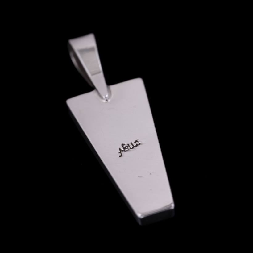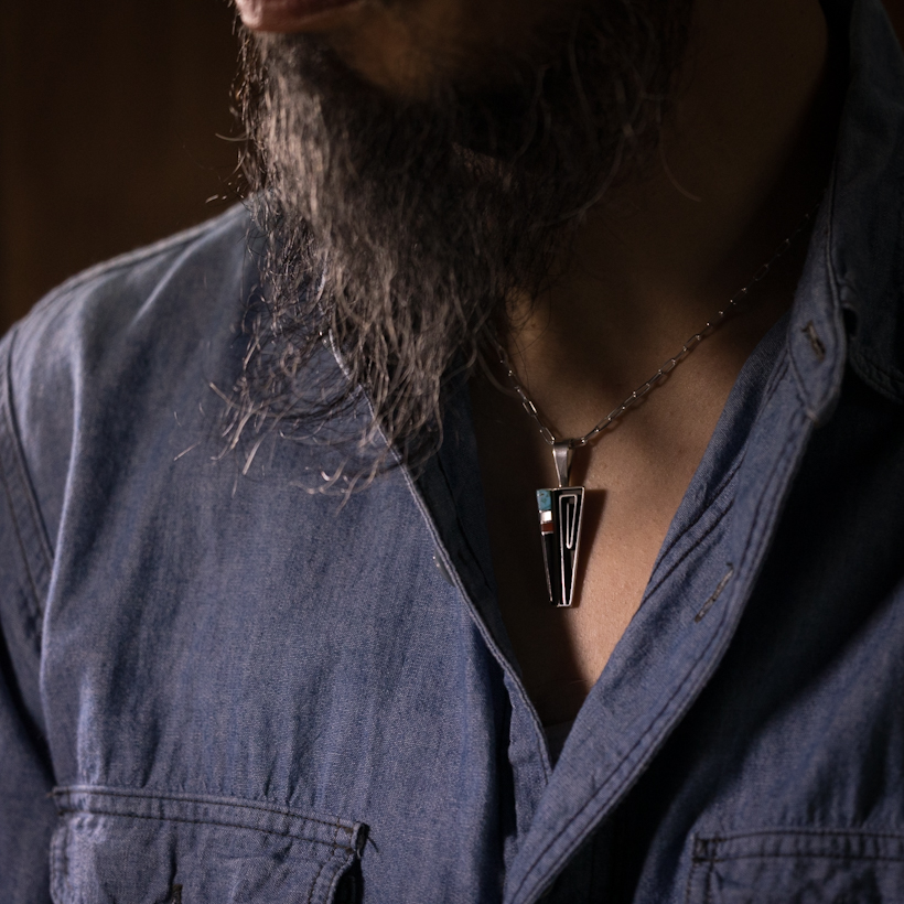NAVAJO/ナバホ族のアーティスト Albert Nells/アルバート・ネルスに制作を依頼したペンダントです。。このスタイルを見れば一目でアルバート氏の作品だとわかる代表的なデザインです。4つの石(青、白、赤、黒)は季節、方角、人生を表し、4の数字は彼らにとって縁起のいいものとされています。また彼の自宅からも見えるナバホの神聖な4つの山をイメージされています。ワイヤーワークは一本のワイヤーを曲げてオーバーレイによって制作されており、石の研磨からすべての作業を自身で行っています。長く作り続けている不変のスタイルだからこそ安心感がありますね。スタイルにも取り入れやすいデザイン性と着けた時の納まり具合、上品さも兼ね備えているので大人のジュエリーとしてスタイリングをお楽しみください。 |