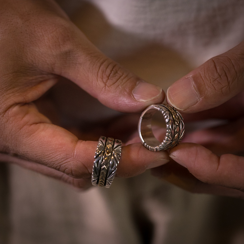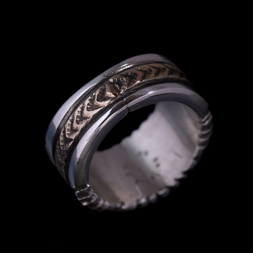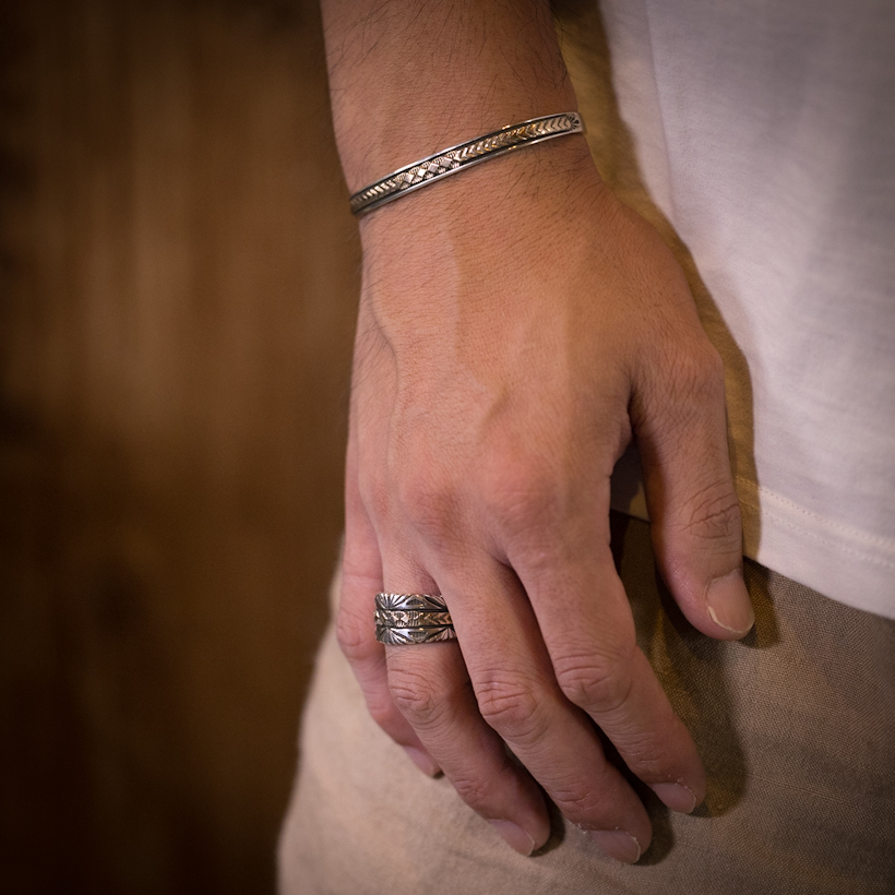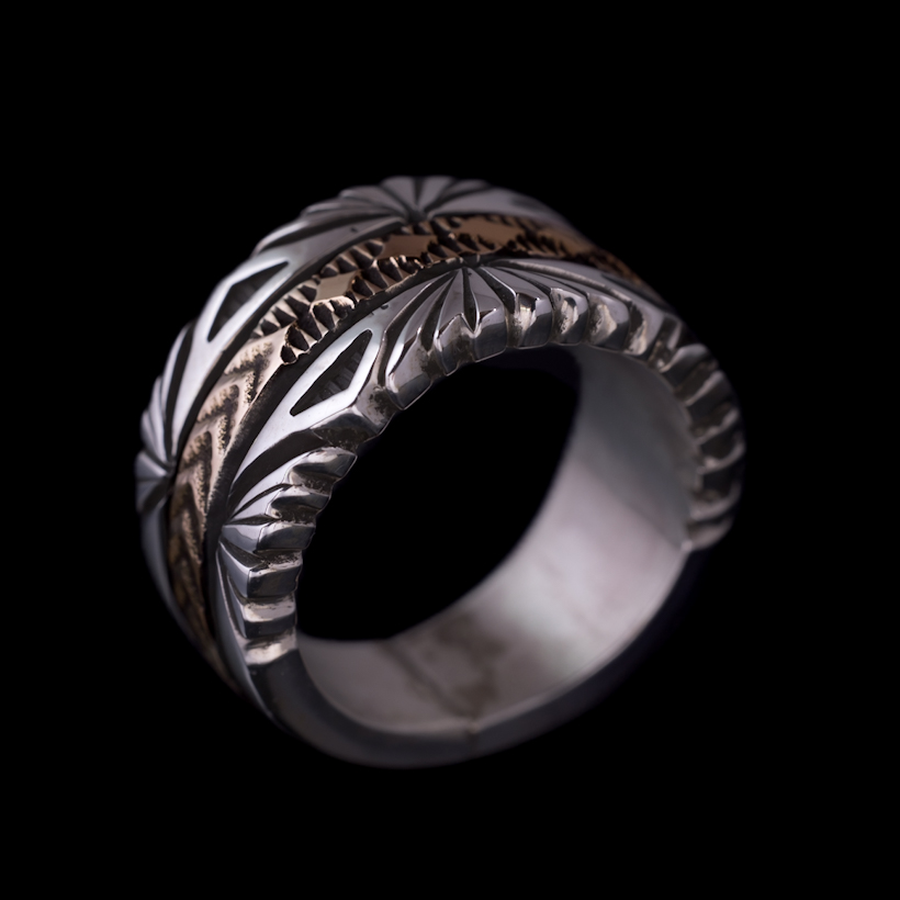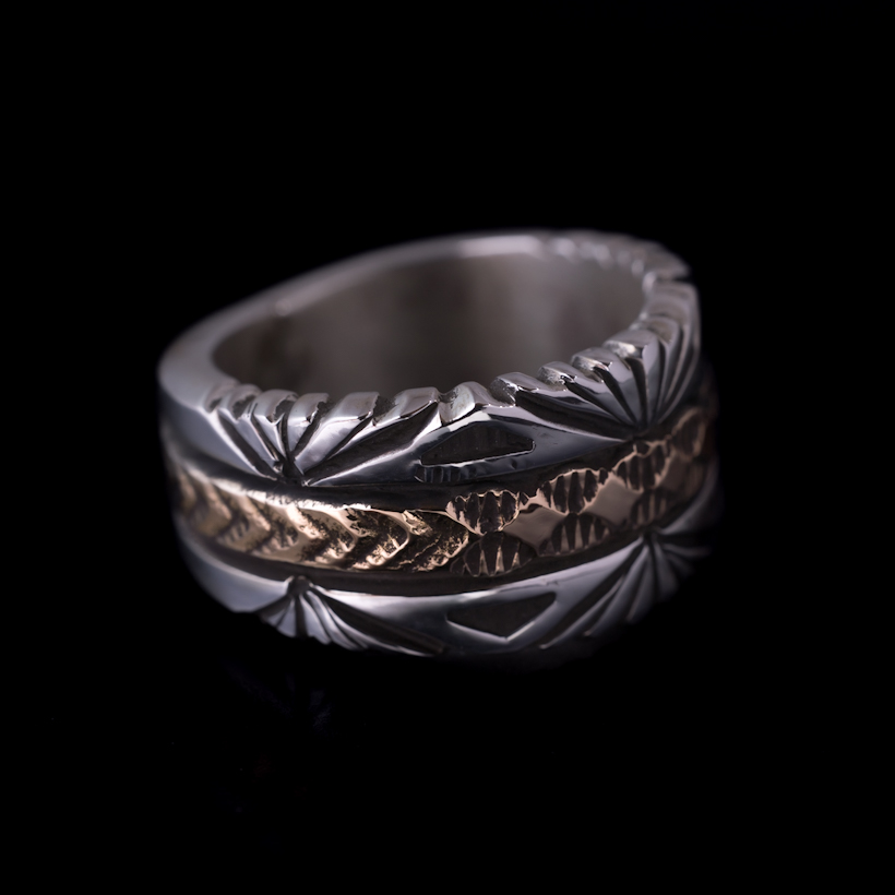 | NAVAJO/ナバホ族のアーティスト Bruce Morgan/ブルース・モーガンに制作を依頼したリングです。シルバーに14Kを組み合わせた作品、ブルース氏の自宅から見えるサンバーストをイメージして取り入れていただき、14Kゴールド部分はRIVER MAIL企画による"4つのダイヤにアロー"を組み合わせたデザインで制作していただきました。(4の数字は縁起のいいものとされており、季節、方角、人生を表しています)またシルバーの厚みは通常使用しているゲージより厚みのあるものをしようしていただきましたので、側面の凹凸や重厚感が得られています。 フォルムはボトムに向かうほど細くなるテーパー付きとなり、着け応えのある12mm幅に厚みがあるのでしっかりと満足感を感じます。シンプルに単体で着けられても品が出ますし、大人のジュエリーとしてスタイリングをお楽しみください。 |