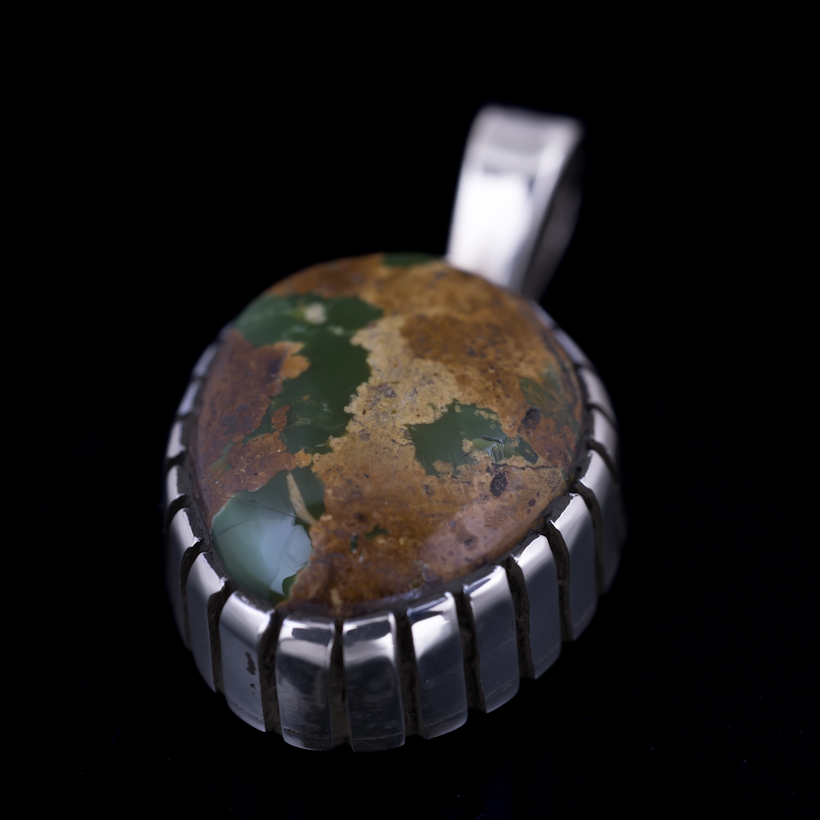 | ロイストンを使用したRIVER MAIL企画によるペンダントです。ベゼルの高さとボリューム感を意識した作品、主役のターコイズがしっかりと引き立つデザインです。コンパクトでバランスの良いサイズ感はスタイルをの幅を広げれるアイテムで、単体で着けられるのはもちろんですが、他のペンダントと重ねて着けられるのにもおすすめのサイズ感です。バチカンの厚みなどもしっかりとあるので、少し太めのチェーンを通されても着け負けないしっかり感があります。皮ひも、シルバーチェーン、ヒシネックレスなどそれぞれのスタイリングをお楽しみください。 |
