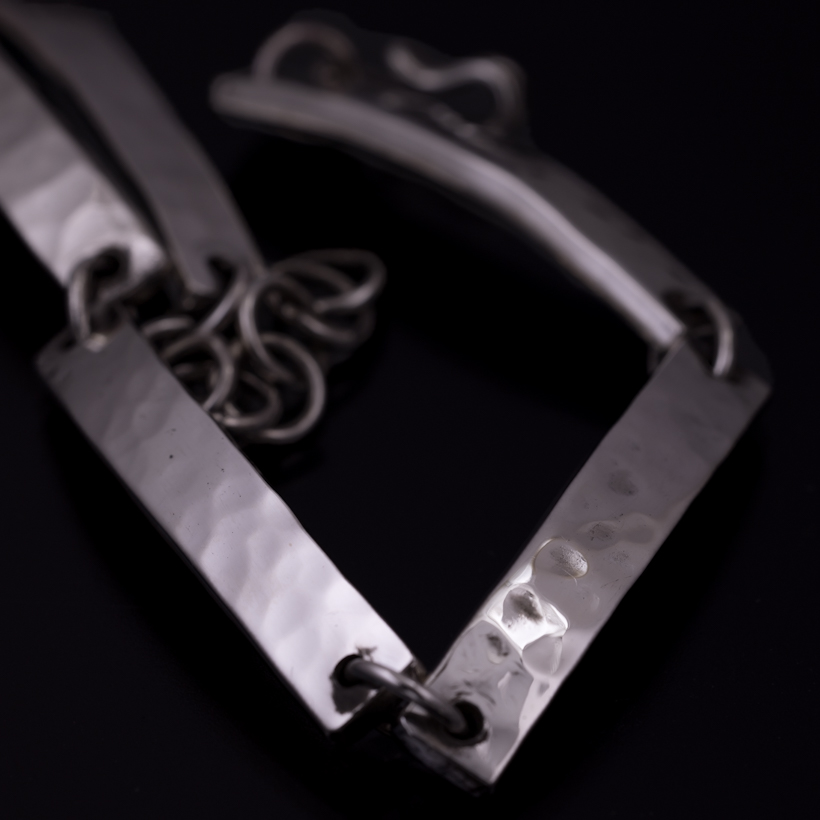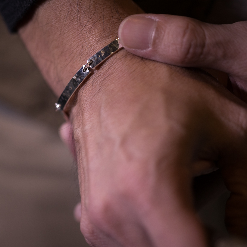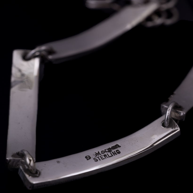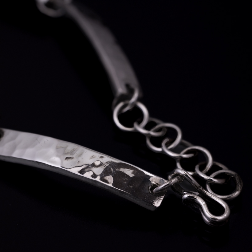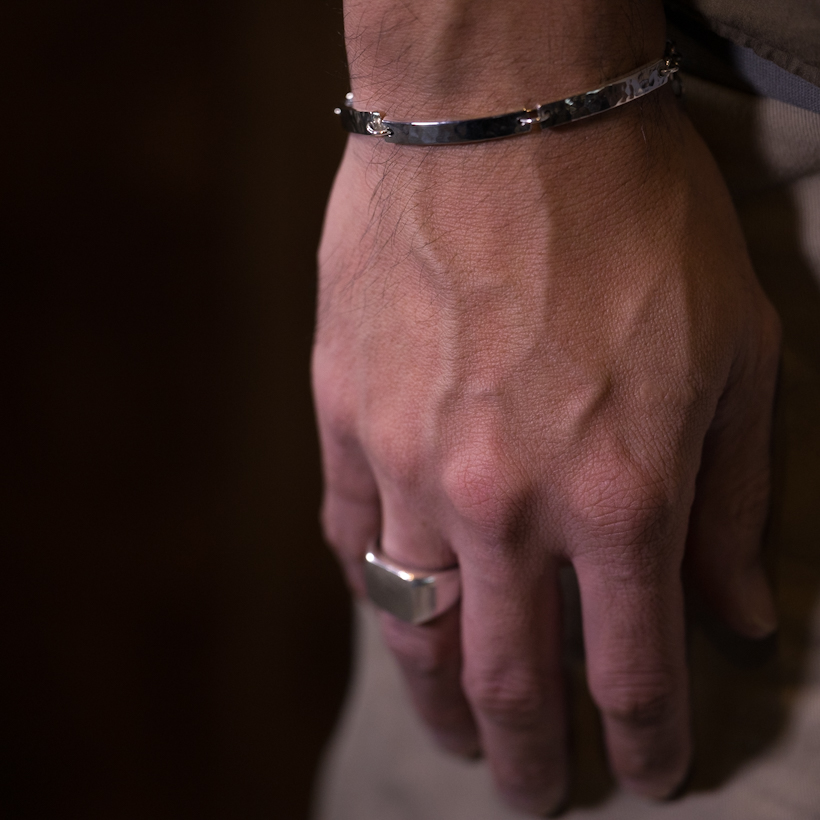 | NAVAJO/ナバホ族のアーティスト Bruce Morgan/ブルース・モーガンに制作を依頼したブレスレットです。ハンマーで表面を叩くことでランダムに模様が生まれたハンマーテクスチャです。光の当たり具合でキラキラと光沢が出るのが特徴で、シンプルでクリーンな作品に仕上がっています。5つのプレートは腕に沿うように緩いカーブが付けられおり、幅は細身ですが、それを感じさせない厚みと光沢のおかげで丁度よい存在感を感じます。主役としてスタイルしていただくのはもちろんですが、他のアクセサリーとも組み合わせがしやすいシンプルさがこのデザインの良さでもあるので、重ね着けとしてもお勧めです。バングルに慣れていない方でもブレスレットタイプでしたら安心してお使いいただけるかと思います。 |