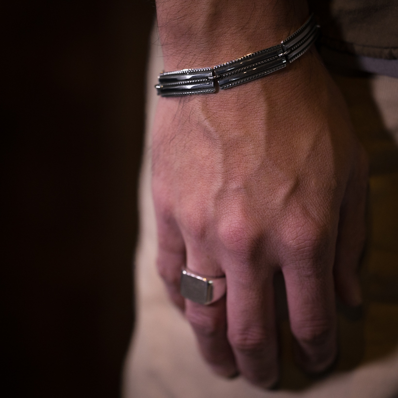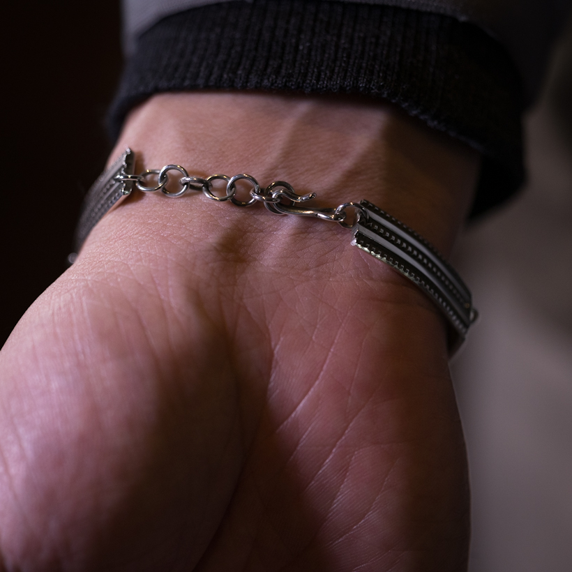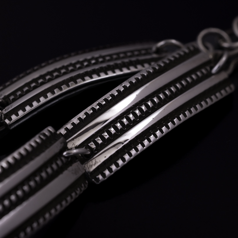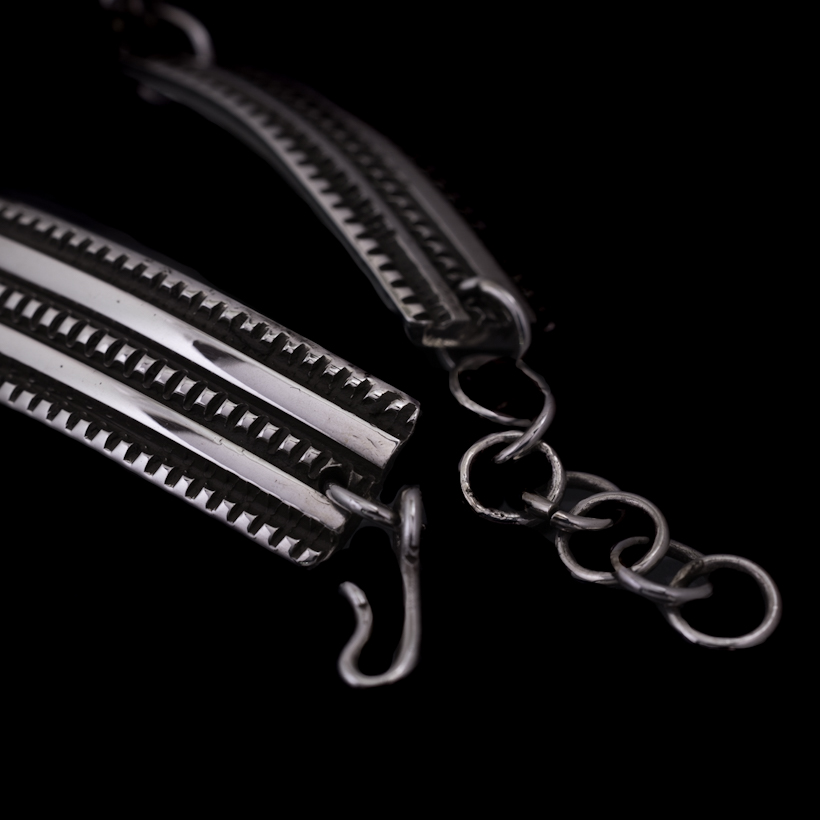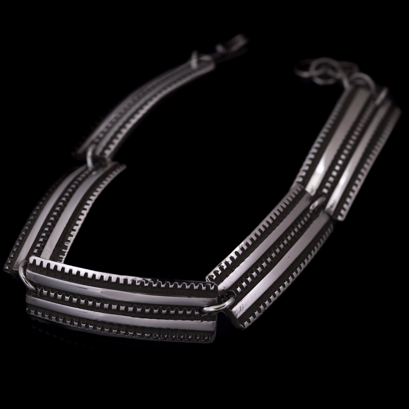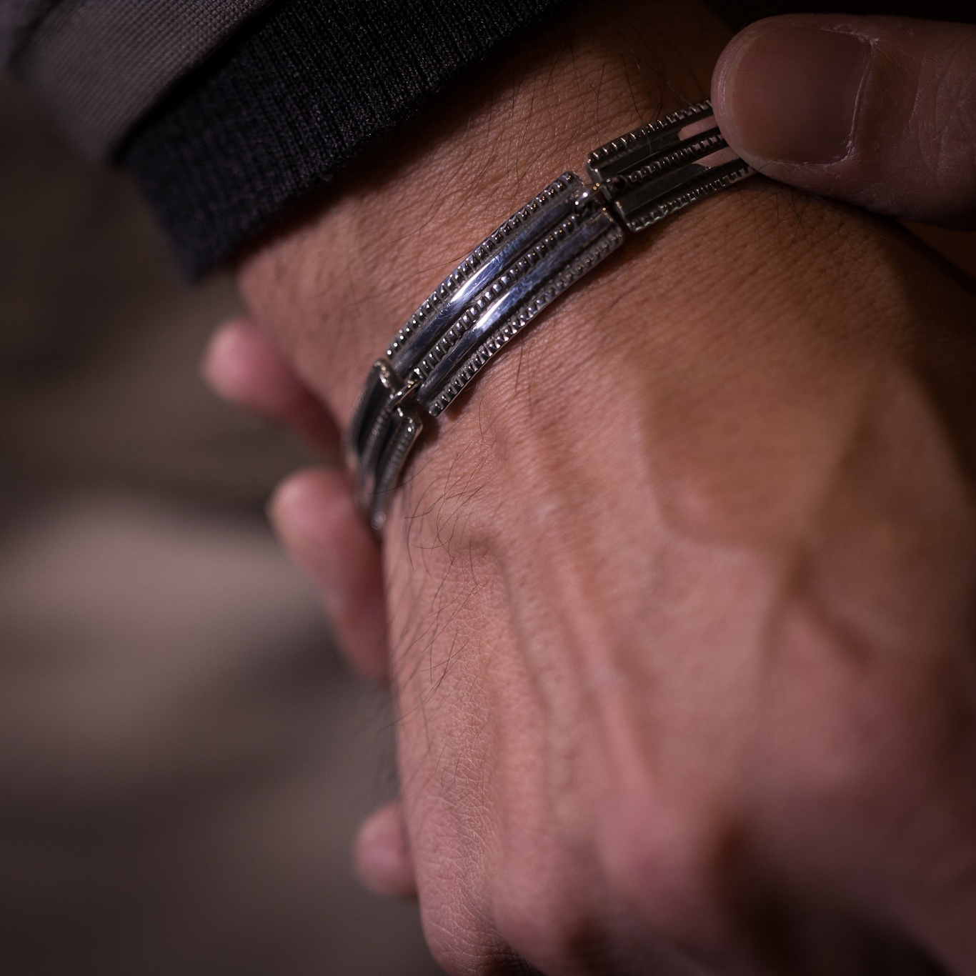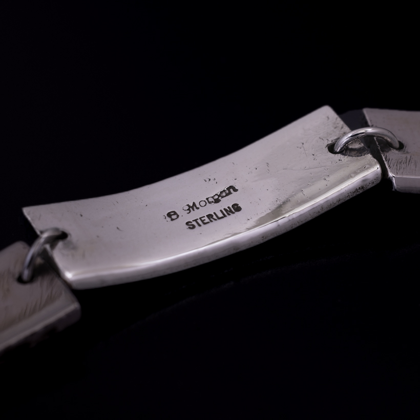 | NAVAJO/ナバホ族のアーティスト Bruce Morgan/ブルース・モーガンに制作を依頼したブレスレットです。連チゼルワークによるベーシックなデザイン、もともとは当店で発案し制作を依頼したものですが、ブレスレットとして改めて制作していただきました。、5つのプレートは腕に沿うように緩いアールが効いており、フックを丸カン(お好みの位置)に引っかけていただくことで着用が可能です。主役としてスタイルしていただくのはもちろんですが、他のアクセサリーとも組み合わせがしやすいシンプルさがこのデザインの良さでもあるので、重ね着けとしてもお勧めです。バングルに慣れていない方でもブレスレットタイプでしたら安心してお使いいただけるかと思います。 |