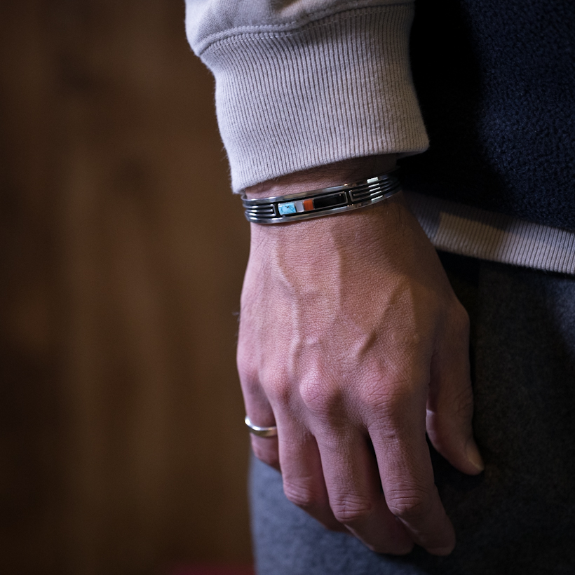 | NAVAJO/ナバホ族のアーティスト Albert Nells/アルバート・ネルスに制作を依頼したバングルです。一目でアルバート氏の作品だと分かる代表的スタイルで制作をお願いいたしました。4つの石(青、白、赤、黒)は季節、方角、人生を表し、4の数字は彼らにとって縁起のいいものとされています。また彼の自宅からも見えるナバホの神聖な4つの山をイメージされています。ワイヤーワークは一本のワイヤーを曲げてオーバーレイによって制作されており、石の研磨からすべての作業を自身で行っています。長く作り続けている不変のスタイルだからこそ安心感がありますね。多くのファンから支持されているのも納得します。スタイルにも取り入れやすいデザイン性と着けた時の納まり具合、上品さも兼ね備えているのでいつもの服装にワンポイント取り入れるだけでスパイスとしての役割を... |