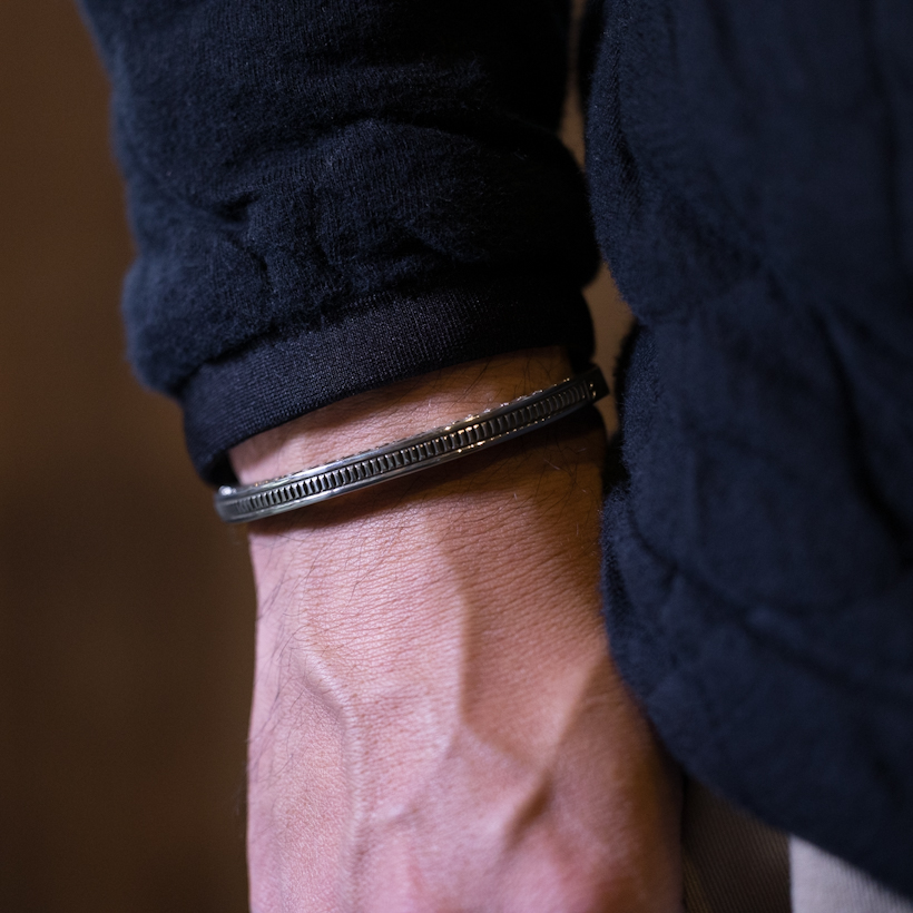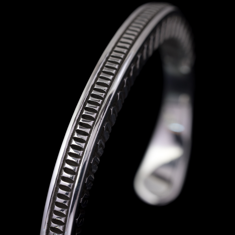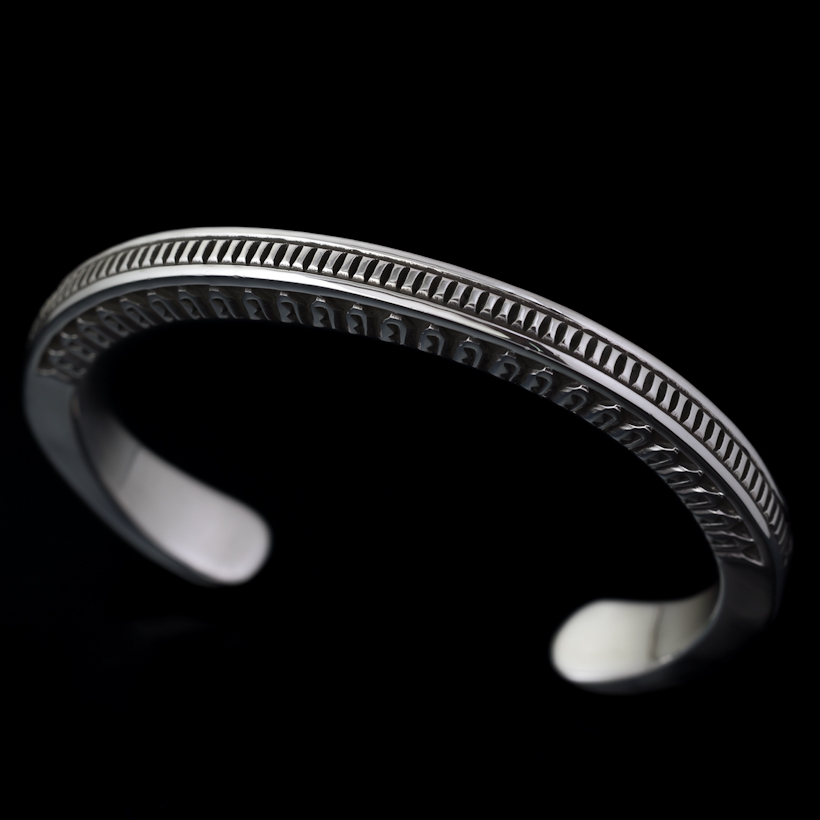| Navajo/ナバホ族のアーティスト Lyle Secatero/ライル・セカテロに制作を依頼をしたバングルです。厚みのあるスクエアワイヤーを用いて、雨を表すストライプデザインを挟むかたちで両側面にフェザーを施していただきましたが、等間隔で一つ一つ深く丁寧にスタンプされているのが作品から伝わってきます。エンドはスクエアから平面に形状が変わり、夕日を表す太陽と雲がデザインされています。ライル氏の世界観がしっかりと感じていただけるバングルに仕上がっています。スクエアワイヤーを使用した作品は使い勝手の良さが人気の一つでもあり、この厚みは重厚感ともに満足感があります。単体でも十分な存在感が得られますが、重ね着けする際には厚みがありますのでフラットなバングルや形状を変えてトライアングルと組み合わせてスタイルを作り上げる楽しさもあります。使用していくと経年変化による雰囲気が増していきますので、作品自体も引き締まっていきます。ぜひお楽しみください。内周は開口部を含めて167mmほどになりますので、手首サイズ157mm〜167mmの方にお勧めです。多少のサイズ調整は可能ですので、ご希望の方はお気軽にご相談ください。 |