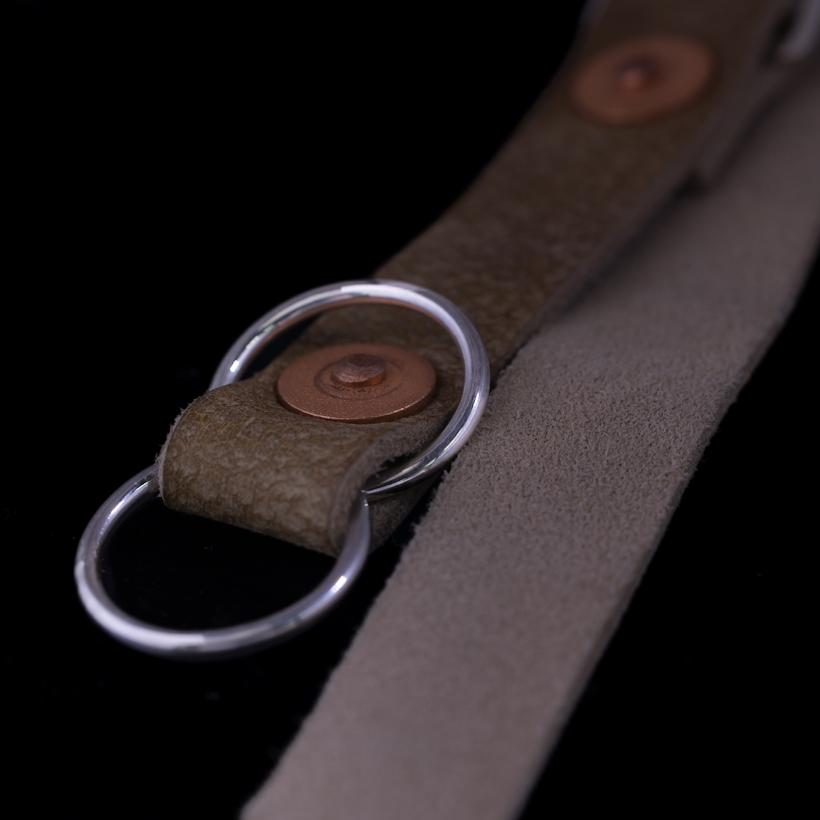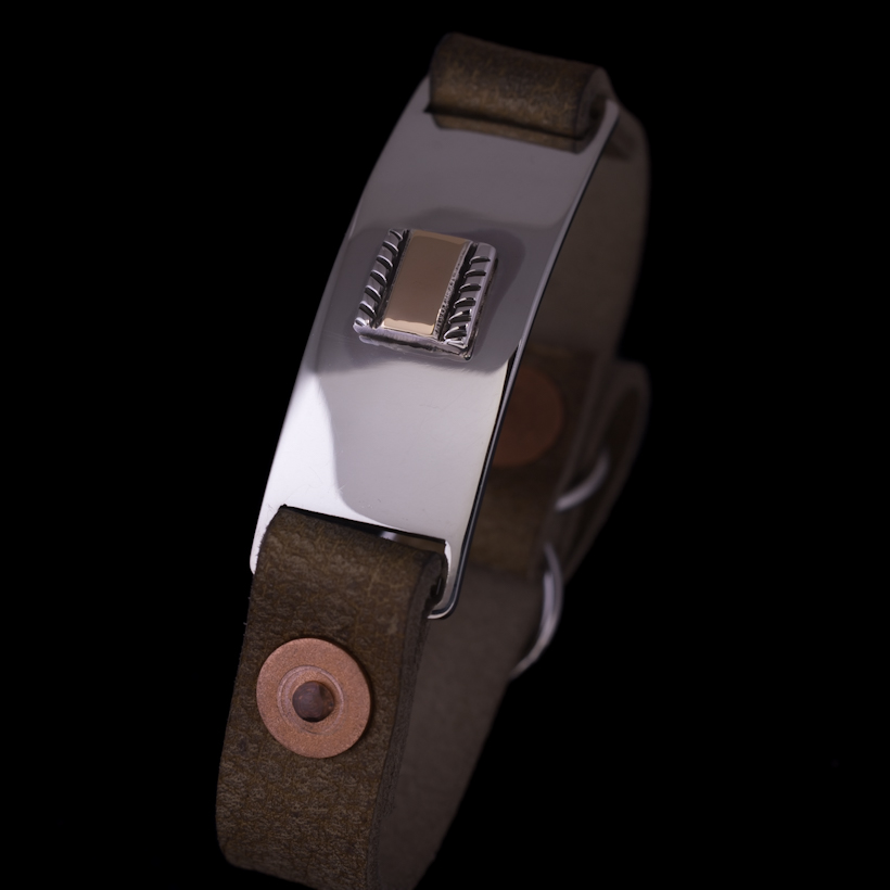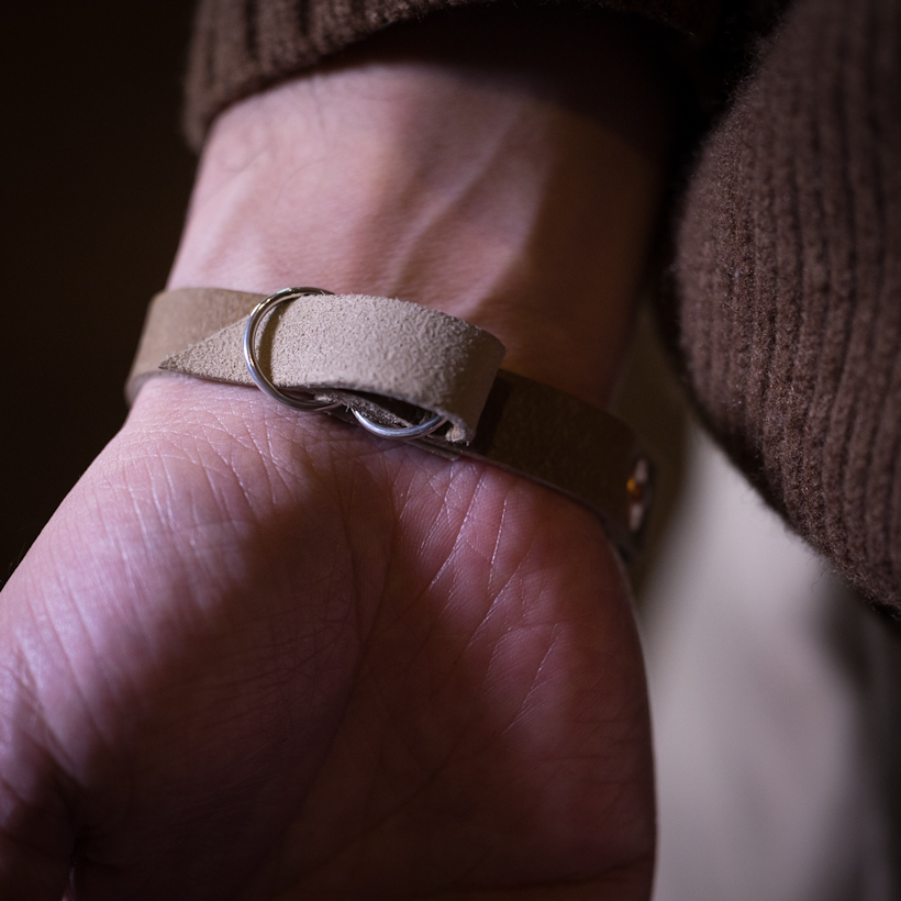 | NAVAJO/ナバホ族のアーティスト Bruce Morgan/ブルース・モーガンと神戸を拠点とする革製品工房 Anchor Bridgeとの3社共同企画によるブレスレットです。当店オリジナルのプレート(SS)と丸カン(SS)にブルース・モーガン氏による14Kチゼルが施された正方形のパーツを組み合わせ、レザーベルトはAnchor Bridgeに制作していただきました。シルバー、ゴールド、レザーとそれぞれの良さが組み合わさり、大人が身に着けれるブレスレットを意識しました。革はKUDU(クードゥー)を使用しました。ふわりとしつつ、柔らかい質感、裏面のスエード地もきれいで肌あたりも優しく感じます。留め方はリングベルトのようにサイズ調整が自由に設定が可能ですので、お好みのサイズで合わせていただけます。着用してみるとまず落ち着いたレザーの色合いが印象的で、シルバーの主張感とさりげないゴールドがアクセントとして効いています。着けた時の質感もソフトで、見た目も重たい雰囲気になりません。時計を着けるかのような感覚でスタイリングを楽しめます。 |