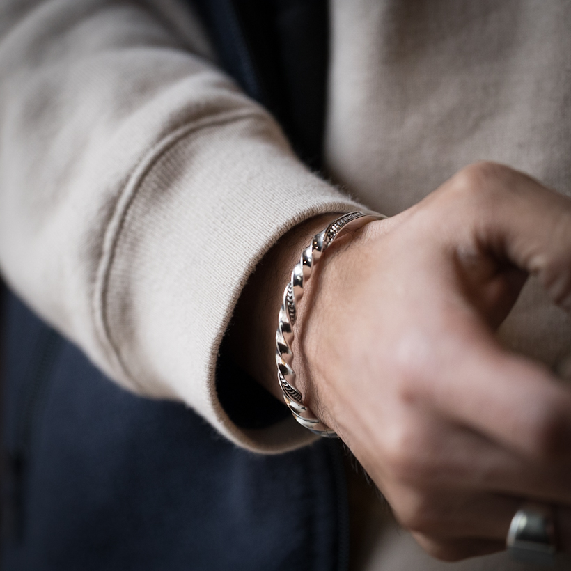 | Navajo/ナバホ族のアーティスト Lyle Secatero/ライル・セカテロに制作を依頼をした当店企画によるバングルです。幅、厚みとも約4mmのスクエアワイヤーを用いて、波紋を表すウォーターを1面に入れていただき、見る角度で表情に変化が出るように捻りを加えていただくようにお願いしました。エンドはスクエアから平面に形状が変わり、見た目では分からない安定感のある着け心地が得られています。ライル氏の世界観がしっかりと感じていただけるバングルに仕上がっています。 スクエアワイヤーを使用した作品は使い勝手の良さが人気の一つでもあり、この丁度よい厚みはスタイリングのしやすさが抜群です。単体でシンプルに着けるのもいいですし、脇役としてフラットなバングルや形状を変えてトライアングルと組み合わせてスタイルを作り上げるのもいいですね。また鏡面仕上げのしっかりと磨きが掛かった美しい光沢は使用していくと経年変化による雰囲気が増していきます。インディアンジュエリー好きはもちろん、服好きなら一本は持っておきたいユーティリティーアイテムですね。 サイズは手首から+10mmまでの内周(開口部を含む)がお勧めになりますのでご参考にしてください。(例:手首160mmですと5 3/4がお勧めのサイズになります)±5mmほどはサイズ調整も可能ですので、サイズでお悩みでしたら事前にご相談ください。 |