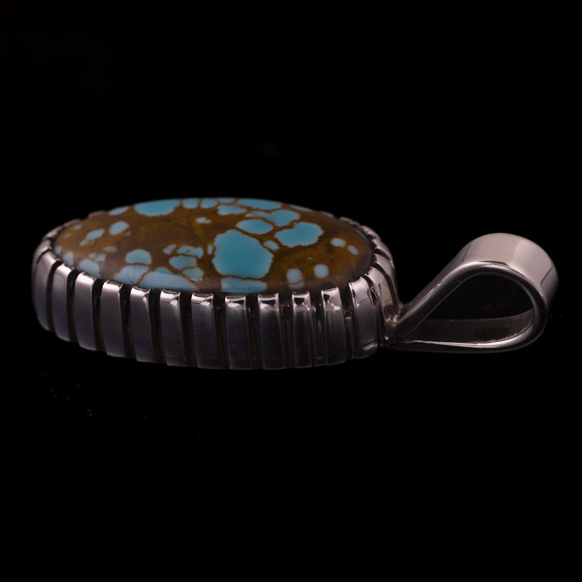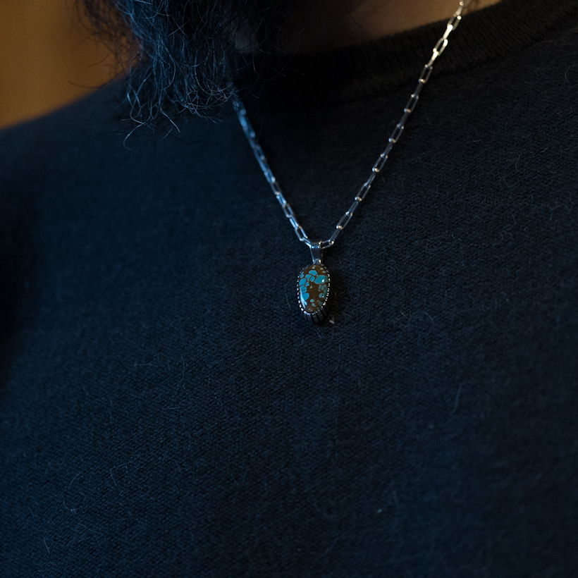 | パイロットマウンテンを使用したRIVER MAIL企画によるペンダントです。ベゼルの高さとボリューム感を意識した作品、主役のターコイズがしっかりと引き立つデザインです。コンパクトでバランスの良いサイズ感はスタイルをの幅を広げれるアイテムで、単体で着けられるのはもちろんですが、他のペンダントと重ねて着けられるのにもおすすめのサイズ感です。バチカンの厚みなどもしっかりとあるので、少し太めのチェーンを通されても着け負けしない雰囲気があります。皮ひも、シルバーチェーン、ヒシネックレスなどそれぞれのスタイリングをお楽しみください。 |
