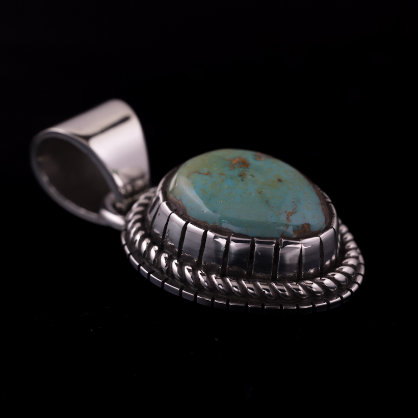 | ロイストーンを使用したRIVER MAIL企画によるペンダントです。ロープワイヤーに高さのあるベゼルが印象的な作品、主役のターコイズがしっかりと引き立つスタイルです。コンパクトでバランスの良いサイズ感はスタイルをの幅を広げれるアイテムで、単体で着けられるのはもちろんですが、他のペンダントと重ねて着けられるのにもおすすめのサイズ感です。バチカンの厚みなどもしっかりとあるので、少し太めのチェーンを通されても着け負けしない雰囲気があります。皮ひも、シルバーチェーン、ヒシネックレスなどそれぞれのスタイリングをお楽しみください。 |