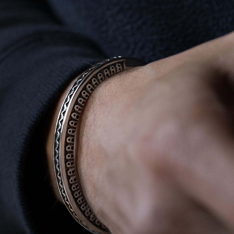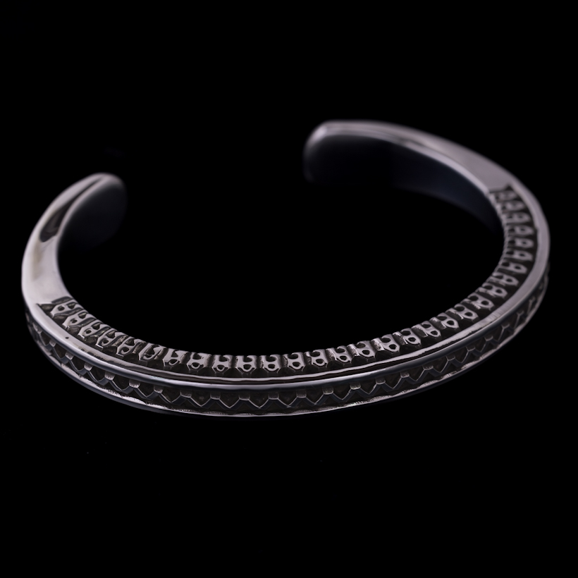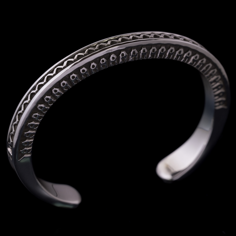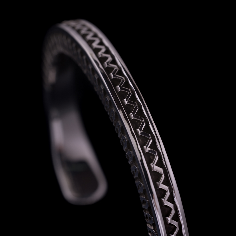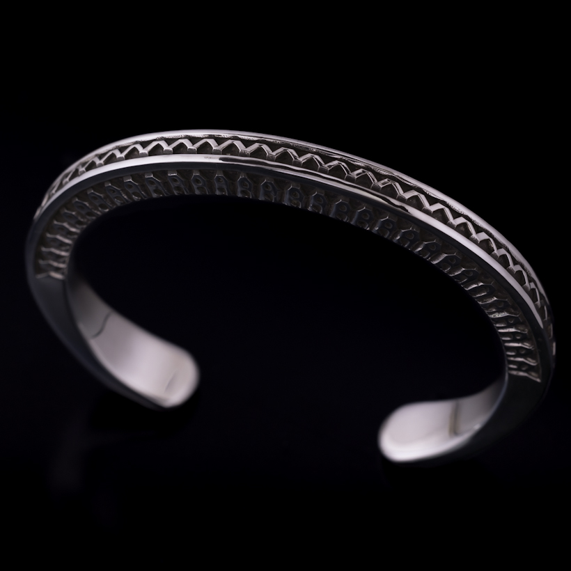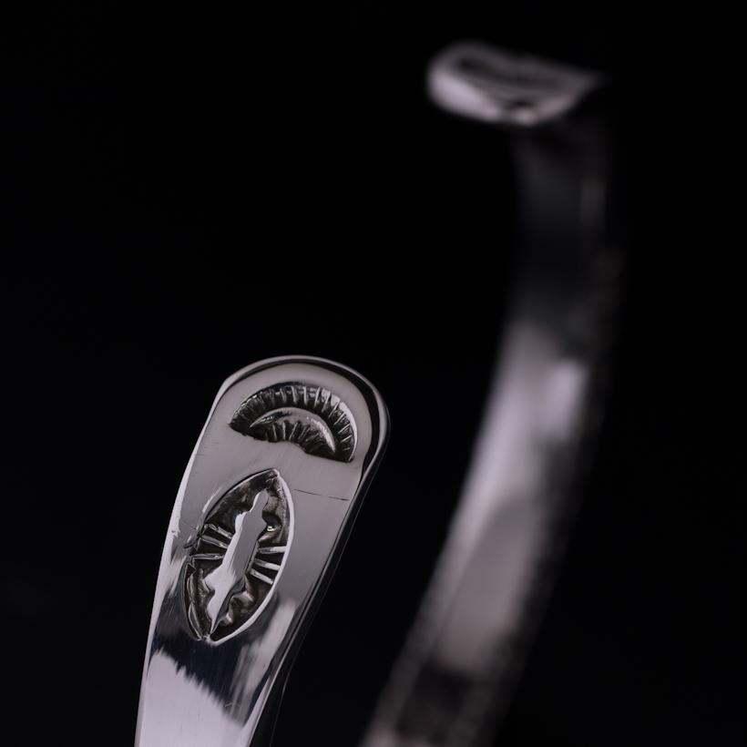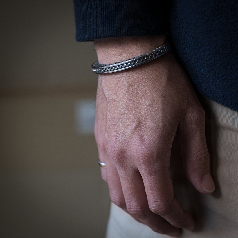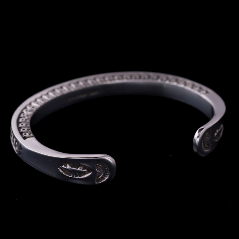 | Navajo/ナバホ族のアーティスト Lyle Secatero/ライル・セカテロに制作を依頼をしたバングルです。厚みのあるスクエアワイヤーを用いて、雷を表すライトニングを挟むかたちで両側面にフェザーを施していただきましたが、等間隔で一つ一つ深く丁寧にスタンプされているのが作品から伝わってきます。エンドはスクエアから形状が変わり平面になり、夕日を表す太陽と雲がデザインされています。ライル氏の世界観がしっかりと感じれていただけるバングルに仕上がっています。 スクエアワイヤーを使用した作品は使い勝手の良さが人気の一つでもあり、この厚みは重厚感ともに満足感があります。単体でも十分な存在感が得られますが、重ね着けする際には厚みがありますのでフラットなバングルや形状を変えてトライアングルと組み合わせてスタイルを作り上げる楽しさもあります。使用していくと経年変化による雰囲気が増していきますので、作品自体も引き締まっていきます。ぜひお楽しみください。 内周は開口部を含めて171mmほどになりますので、手首サイズ161mm〜171mmの方にお勧めです。±5mm~10mmほどはサイズ調整可能かと思いますので、ご希望の方は事前にご相談ください。 |