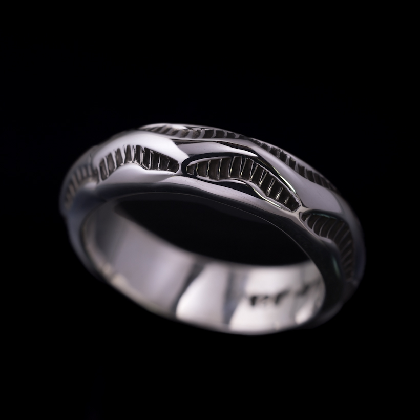 | Navajo/ナバホ族のアーティスト Lyle Secatero/ライル・セカテロに制作を依頼をしたリングです。幅、太さ、重さともにリングにちょうど良い#4ハーフラウンドワイヤーを使用していただきました。デザインは雷を表すライトニング、平面にスタンプを打つわけではなく曲面にスタンプをしていくので、技術もそうですがずれないように打つ集中力が必要なため、より丁寧な仕事が要求されます。スクエア、トライアングルとそれぞれの良さがありますが、ハーフラウンドの柔らかい雰囲気は他の形状にはない良さがありますね。 実際に着けてみるとその納まり具合、スタイリングのしやすさは初めてリングを着けられる方でも違和感がなく、満足感を感じていただけると思います。シンプルですがボリューム感があるので物足りなさも感じず、使い勝手の良さは間違いないですね。個性的な作品もいいですが、日常使いに気軽に取り入れていただきたいと思います。"いつも身に着けておきたい"と思えるそんなリングをイメージしました。 |