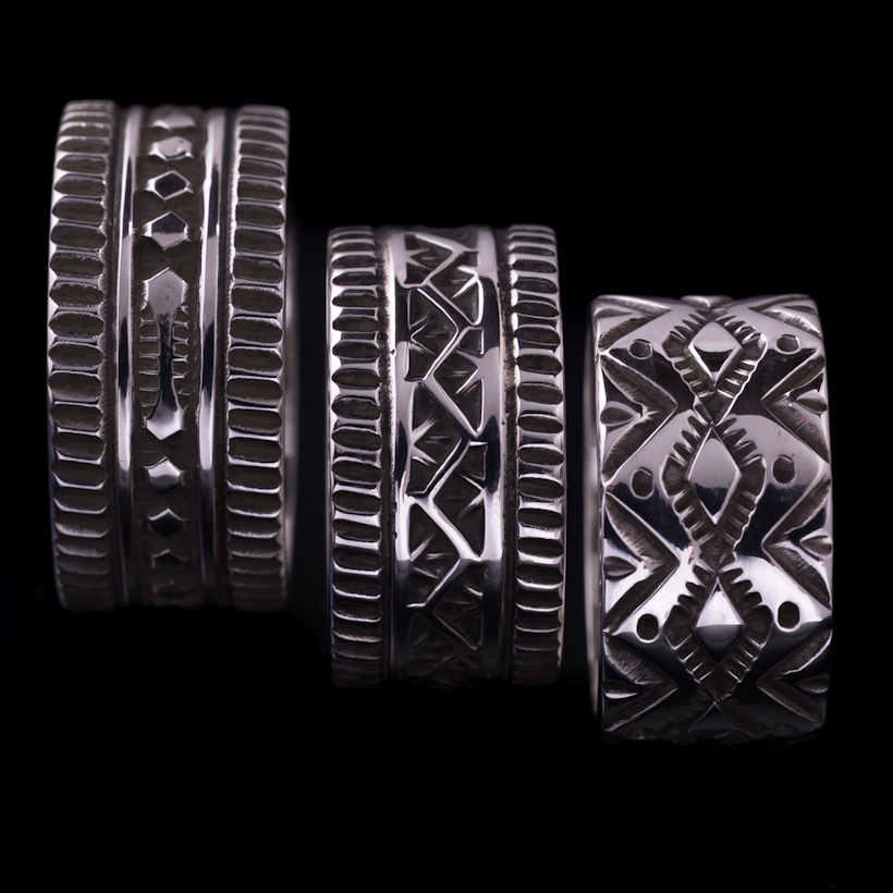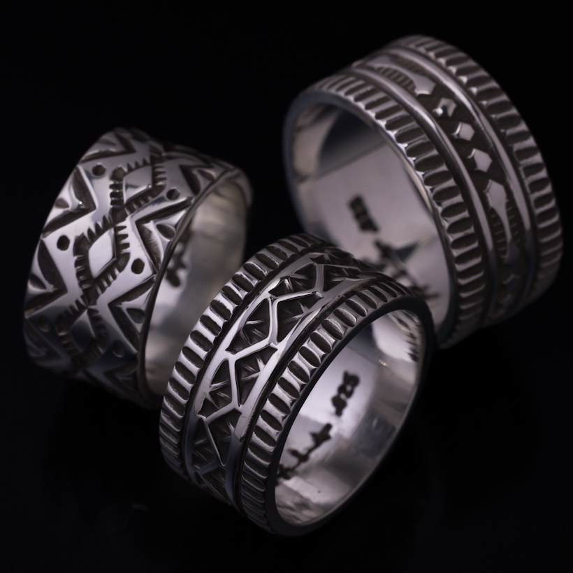 | Navajo/ナバホ族のアーティスト Lyle Secatero/ライル・セカテロに制作を依頼をした当店企画のリングです。14gaの厚み用いて、メインとして活躍してくれる10mm幅にスタンプを施していただき、通常ハーフスタンプになるところを一周スタンプを入れていただきました。デザインは雲と雨が降る様子、そしてライル氏オリジナルの4つの季節、4つの方角、4つの人生を表すフォーディレクションが施されています。ナバホの伝統と彼のスタイルが組み合わさった作品に仕上がっています。 ベーシックなバンドリングはスタイルには欠かせないアイテムになります。実際に着けてみるとその納まり具合、スタイリングのしやすさは初めてリングを着けられる方でも違和感がなく、満足感を感じていただけると思います。幅もあるので物足りなさも感じず、使い勝手の良さは間違いないですね。個性的な作品もいいですが、日常使いに気軽に取り入れていただけると思います。経年変化とともにお楽しみください。 |