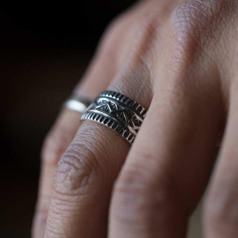 | Navajo/ナバホ族のアーティスト Lyle Secatero/ライル・セカテロに制作を依頼をした当店企画のリングです。14gaの厚み用いて、メインとして活躍してくれる10mm幅にスタンプを施していただき、通常ハーフスタンプになるところを一周スタンプを入れていただきました。一つ一つ深く丁寧にスタンピングされたデザインは稲妻を表すライトニング、ナバホの伝統的でデザインの一つでもあり"恵みの雨と疾さ"を表しており、とされており自然への畏敬の象徴とされている。 ベーシックなバンドリングはスタイルには欠かせないアイテムになります。実際に着けてみるとその納まり具合、スタイリングのしやすさは初めてリングを着けられる方でも違和感がなく、満足感を感じていただけると思います。幅もあるので物足りなさも感じず、使い勝手の良さは間違いないですね。個性的な作品もいいですが、日常使いに気軽に取り入れていただけると思います。経年変化とともにお楽しみください。 |