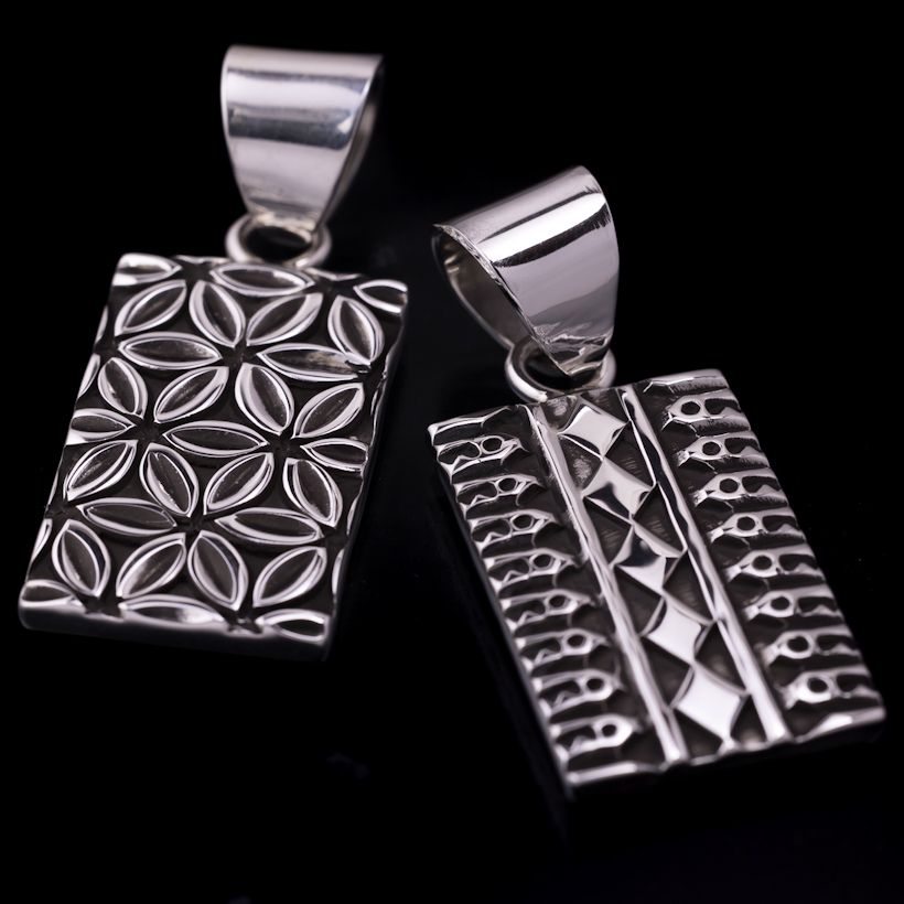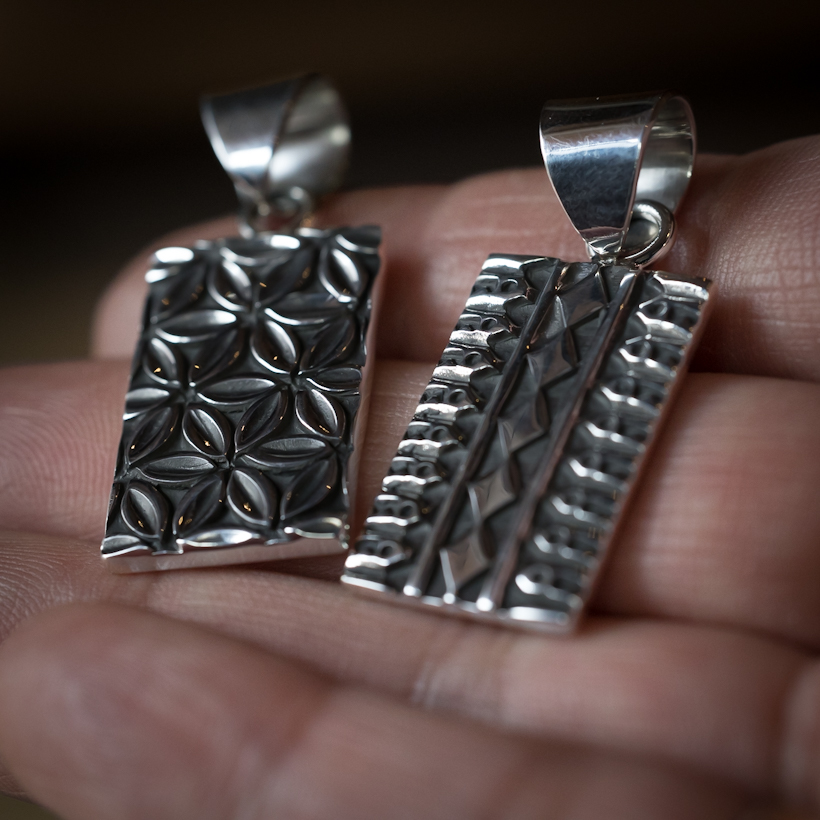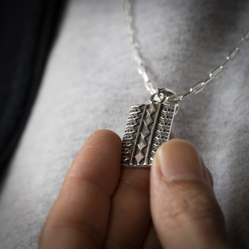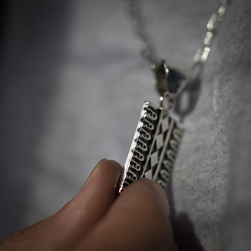 | Navajo/ナバホ族のアーティスト Lyle Secatero/ライル・セカテロに制作を依頼をした当店企画によるペンダントです。10gaの厚み用いていただき、両サイドにフェザーで挟まれるようにダイヤモンドをデザインしていただきました。ダイヤモンド模様はナバホの神聖な4つの山と4つの方角を表しています。インディアンジュエリーの奥深さを感じとる事ができるデザインに仕上げていただいています。 コンパクトなサイズ感で厚みとのバランスをとても意識しました。着けやすさはもちろんですが、普段使いにも気軽に取り入れていただけると思います。ペンダント、ネックレスをこれから着けようかと考えられている方にもおすすめで、お持ちのペンダントと重ねて着けるのにも重宝する作品だと思います。チェーンホールも広めなので太めのチェーン、またはナバホパールと合わされても着け負けしない雰囲気があります。チェーンに変化をつけてスタイリングをお楽しみください。 |