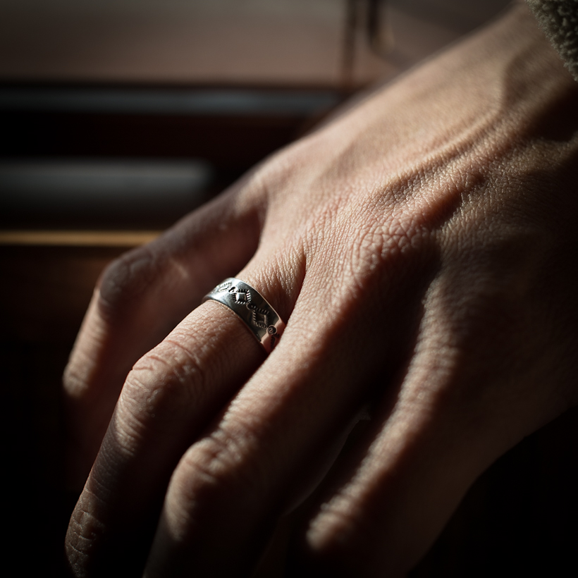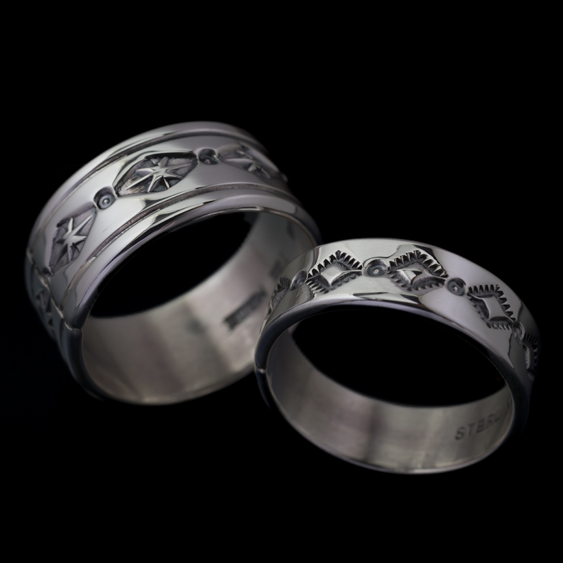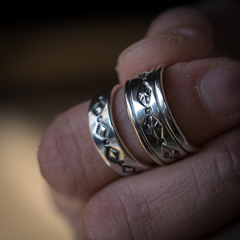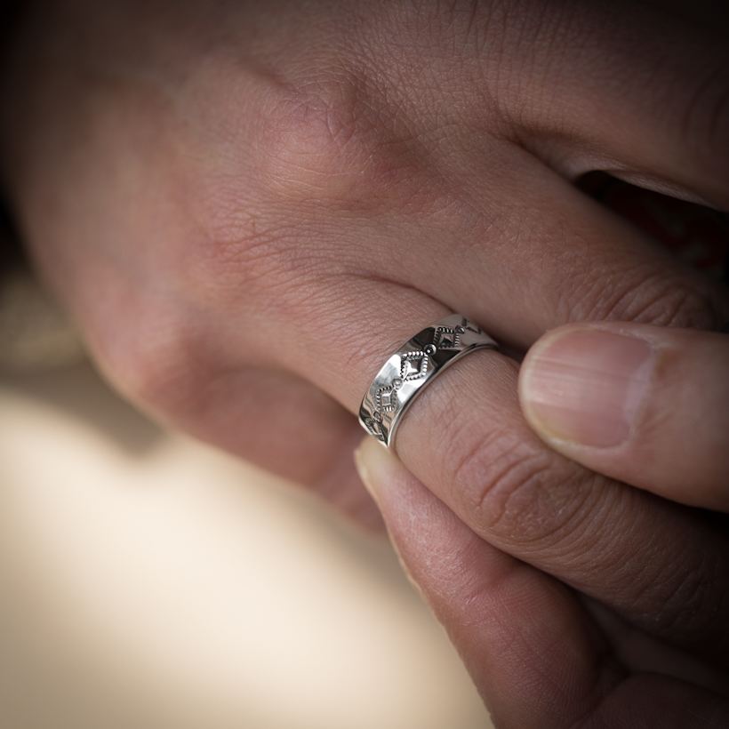 | NAVAJO/ナバホ族のアーティスト Tanya Mace/ターニャ・メイスに制作を依頼したリングです。フェザーのイメージが強いMaceファミリーですが、ナバホジュエリーらしいベーシックなスタンプリングで仕上げていただきました。光沢の美しいクリーンで見慣れた感があり、スタイリングのしやすさには安心感があります。 着けた印象としては普段リングを着けられない方でも自然な感じで取り入れていただきやすい作品だと思います。太すぎない幅は物足りなさも感じさせず丁度よいバランスです。デザイン自体に派手さはないので他のジュエリーとの組み合わせも相性よくスタイリングつくりが楽しめますね。 |