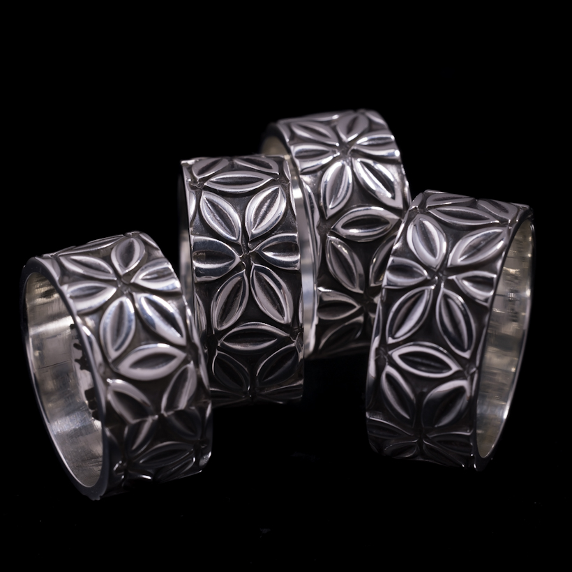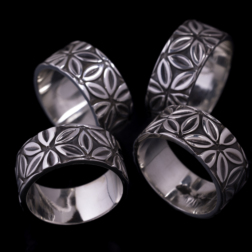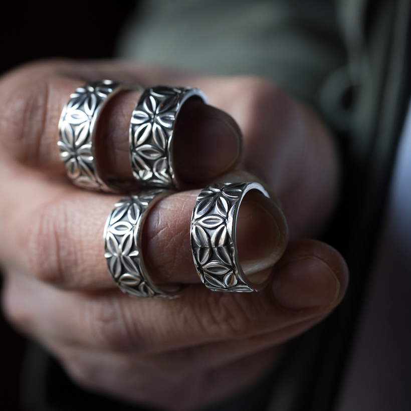 | Navajo/ナバホ族のアーティスト Lyle Secatero/ライル・セカテロに制作を依頼をしたリングです。14gaの厚み用いて、9mm幅にライル氏が家族と共にガーデニングをしている際に思いついたフラワーデザインを全面にスタンプで施していただきました。 ベーシックなバンドリングはスタイルには欠かせないアイテムになります。実際に着けてみるとその納まり具合、スタイリングのしやすさは初めてリングを着けられる方でも違和感がなく、満足感を感じていただけると思います。幅もあるので物足りなさも感じず、使い勝手の良さは間違いないですね。個性的な作品もいいですが、日常使いに気軽に取り入れていただけると思います。経年変化とともにお楽しみください。 |