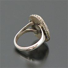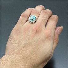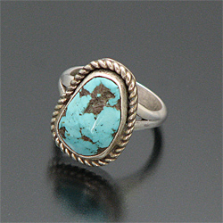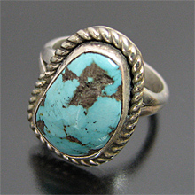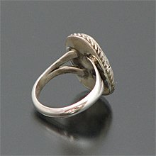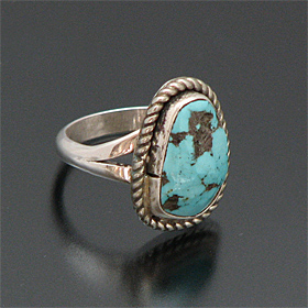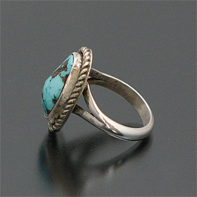 | SANTO DOMINGO/サントドミンゴ族の有名アーティスト Joe Tortalita/ジョー・トルタリータが制作したリングです。 80歳を過ぎた現在も制作を行っているジョー・トルタリータは1922年生まれで、「ターコイズ」BooKにも掲載されている、有名アーティストです。 細かい作業は年齢を感じさせないとても美しい仕上がりです。 キングマンを大胆に使用した作品で、凹凸の表面を残すことで、より雰囲気を醸し出しています。 | ||