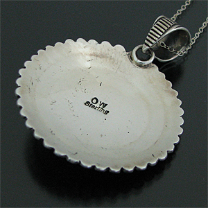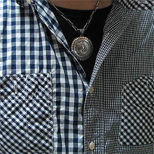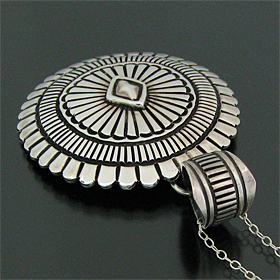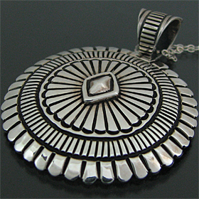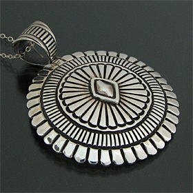 | NAVAJO/ナバホ族の人気アーティスト Orville White/オービル・ホワイトがスタンプワークを用いて制作したネックレスです。 アーティストが得意としているスタンプを用いて制作されており、サークル型の存在感のある大きさに仕上がっています。 正確で綺麗なスタンプが力強く打ち込まれており、一見して彼の作品とわかる美しさがあります。 スタンプワークはナバホ族が得意とする技法で、1880年〜90年代に発展しブレスレット・コンチョ・バックルなどの表面に、ハンマーでたがねを打ちつけ、銀の表面にデザインを施していきます。 スタンプ自体も各アーティストのオリジナルで、自動車のボルトを熱して先端に模様を刻みつけるなどして、さまざまなデザインを制作します。 | ||