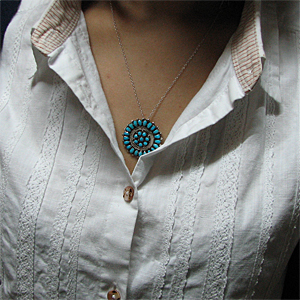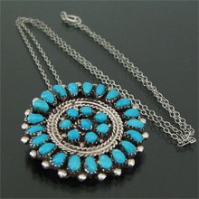 | NAVAJO/ナバホ族のアーティストがクラスター技法を用いて制作したネックレスです。 ズニ族が得意とする石や貝殻をティアドロップ型にカットして花びらのようにアレンジする技法クラスターを用いて制作されています。 存在感のある大きさで、チェーンを外してブローチにも使用する事が出来ますので、カバンなどのアクセントにもなります。 ターコイズの爽やかさが胸元をより華やかに演出してくれます。 また、女性へのプレゼントにもお勧めのアイテムです。 | ||