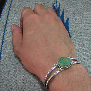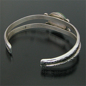 | TAOS/タオス プエブロの有名アーティスト Sonny Spruce/ソニー・スプルースが制作したバングルです。 大胆にターコイズが使用されているソニー・スプルースらしい作品で、巧みにスタンプワークが施されており、伝統を伝える素朴な力強さ、気品さが伝わってきます。 昔ながらのスタイルは今も変わらず、ハンドメイドの温かみを感じる作品に仕上がっています。 10数年前から作風は変わらず、オールドスタイルという枠にピッタリとはまるソニーの作品には、どこか安心感を感じます。 ジュエリーの他にダンスの名手としても有名で、イギリスの王族がこのタオス プエブロに訪問した時には、踊りについて説明役も任されています。 ※サイズは多少変更が出来ますのでお気軽にお問い合わせくださいませ。 | ||