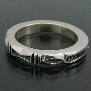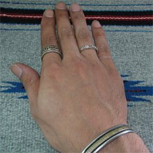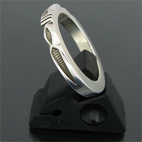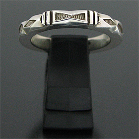 | NAVAJO/ナバホ族の有名アーティスト Jennifer Curtis/ジェニファー・カーティスがスタンプワークを用いて制作したリングです。 父親(トーマス)譲りの分厚いシルバーを用いて、女性アーティストとは思えない程の力強く深いスタンプを施し、ダイナミックながらも繊細なスタンプは女性アーティストらしい綺麗な作品です。 細身でスタイリングしやすく、分厚いプレートを削り、多面的な造形を作り出すエッチング技法と深いスタンプワークが刻み込まれています。 ナバホ族の有名なアーティストであるThomas Curtisの娘であるJenniferは、数少ない女性アーティストならではの細かい技術、父親譲りの力強い作風をバランス良く取り入れた作品を手掛けています。シンプルであればあるほど センスと技術が試されるジュエリー制作の難しさ、彼女だからこそ成し遂げれる技術、常に伝統と新しさをつなげる独自のスタイルを確立しています。 | ||