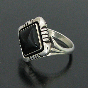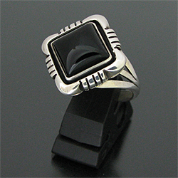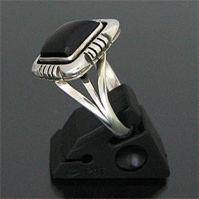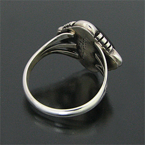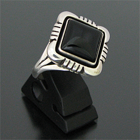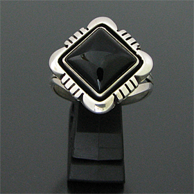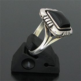 | NAVAJO/ナバホ族のアーティスト Lonnie Willie/ロニー・ウィリーオニキスを用いて制作したリングです。 インディアンジュエリーの中でも人気ストーンの一つ、オニキスが使用されています。 独特の菱型のベースに、ストーンの周りにはシャドーボックス(石の周りの溝部分)が用いられており、この技法によって奥行きがでるので、より立体的な仕上がりとなり、オニキスの美しさを引き立てています。 オニキスはネガティブなヴァイブレーションをポジティブに変える働きがあると言われています。その他に様々な障害を払いのけ、目標へと向かいたいとき力を与えてくれると信じられています。 | ||