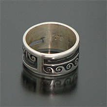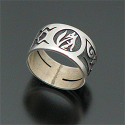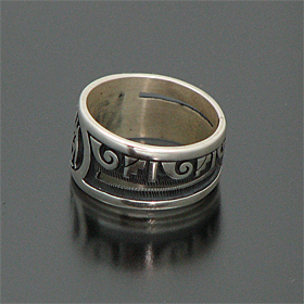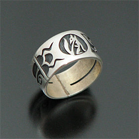 | HOPI/ホピ族の人気アーティスト Lucion Koinva/ルシオン・コインヴァが制作したリングです。 コヨーテがモチーフとなっており、コヨーテは知性の象徴であり、霊的な世界へ行くことができる聖なる存在であるとされています。 サイド部分を切り抜いてあるので、着けている人の指が透けて見える、「スケルトン」タイプの珍しいリングです。 また、左右異なったモチーフが施されているという手の込んだ作りで、とてもスタイリッシュなデザインに仕上がっています! 1989年から製作活動を始め、妻のMelinda Lucas Koinvaとの共同製作も多いアーティストです。 | ||