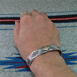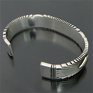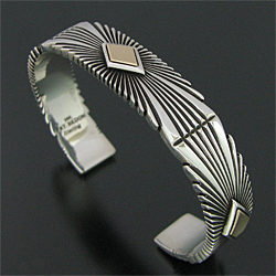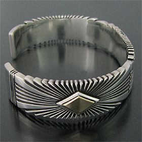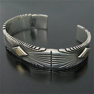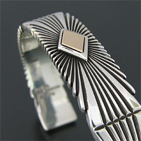 | NAVAJO/ナバホ族の有名アーティスト Patricia Bedonie/パトリシア(パット)・べドニーが制作したサンバースト/太陽光線モチーフのバングルです。 彼女が得意とするサンバーストモチーフが3箇所制作されており、中央のダイヤ型のパーツは14K、ベースはシルバーを使用したコンビで、非常に高級感のある仕上がりとなっています。 正確で丁寧且つシャープなスタンプワークは、女性がスタンプしたとは思えない様な力強いスタンプですが、女性アーティストだからできる繊細さも持ち合わせた作品です。 製作されるサンバーストモチーフは非常に美しく、洗練されています。 また、スタイリングしやすい幅は、女性アーティストらしくシンプルに仕上がっていますが、存在感と高級感も兼ね備えている、とても芸術的な作品です。 製作されるサンバーストモチーフは非常に美しく、日米問わず幅広い支持を得ているアーティストの一人です。 1965年アリゾナ州Ganado生まれ。Navajo族の女性アーティストで、アメリカでも有数のギャラリーでも作品が販売されており、評価も高い人気のアーティストです。 | ||