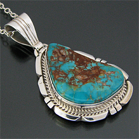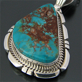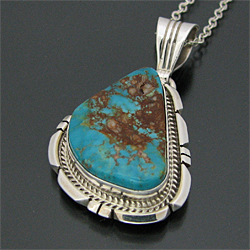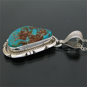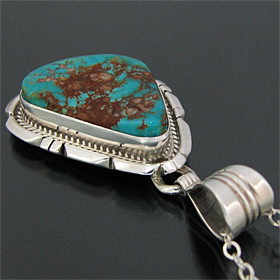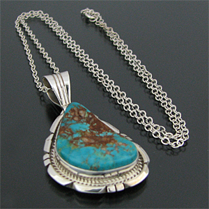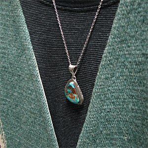 | NAVAJO/ナバホ族のアーティスト Ted Etsittyがメキシコターコイズを用いて制作したネックレスです。 ゴツゴツとしたメキシコターコイズが使用されており、ワイルドな雰囲気が漂っている作品です。 石の形に合わせてデザインを考えて制作しているので、シルバーとのバランスも絶妙です。 バチカン部分の穴が広いので、ナバホチェーン・ホピチェーンと組み合わせるのにもお勧めです。 | ||