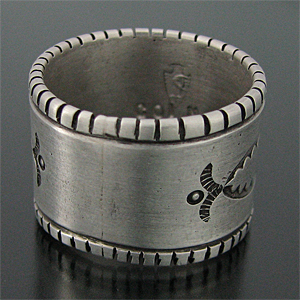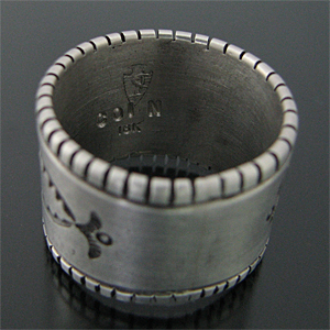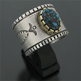 | NAVAJO/ナバホ族のトップアーティストの一人 Darryl Begay/ダリル・ビゲイが制作したコインシルバーのリングです。 ベースに使用されている素材は、1$ モルガン/モーガン コインになります。1921年の鋳造年が刻まれた硬貨が一般的でよく見かけられますが、こちらに使用されているのは1883年の物になります。名称はコインのデザインを担当したイギリスの彫刻家 George T.Morganにちなんで名付けられています。 ターコイズの中でも最も希少価値があり、高価なランダーブルーTQがセットされています。約11mm×約8mmサイズのランダー、美しい色に濃いスパイダーウェブがはっきりと出ています。 一般的にインディアンジュエリーに使われるゴールドは14Kが主流ですが、こちらのベゼルに使用されているゴールドは18Kになります。 リング幅17mmの圧倒的な存在感、ランダーに18K、そしてコインシルバー900の贅沢な組み合わせは、オールドな雰囲気を残しつつもどこか新鮮で、ニュープロジェクトに相応しいダリル渾身の作品です。 | ||
