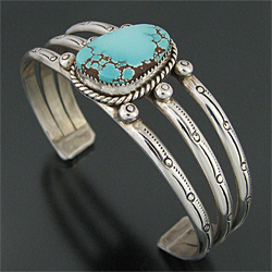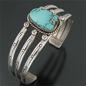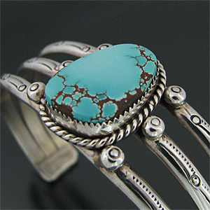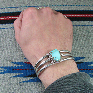 | TAOS/タオス プエブロの有名アーティスト Sonny Spruce/ソニー・スプルースが制作したバングルです。 大胆にターコイズが使用されているソニー・スプルースらしい作品で、巧みにスタンプワークが施されており、伝統を伝える素朴な力強さ、気品さが伝わってきます。 昔ながらのスタイルは今も変わらず、ハンドメイドの温かみを感じる作品に仕上がっています。 10数年前から作風は変わらず、オールドスタイルという枠にピッタリとはまるソニーの作品には、どこか安心感を感じます。 ジュエリーの他にダンスの名手としても有名で、イギリスの王族がこのタオス プエブロに訪問した時には、踊りについて説明役も任されています。 ※サイズ調整可能です。ご希望の方はお気軽にお問合せください。 | ||