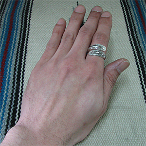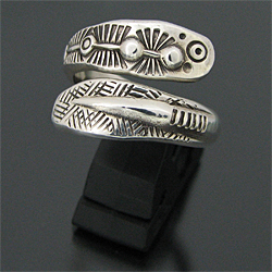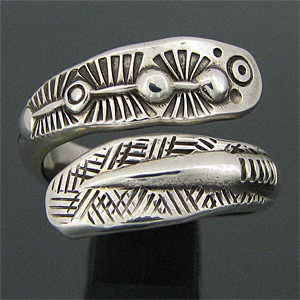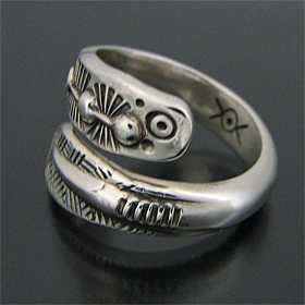 | 個性的なデザインで数々の賞を獲得しているNAVAJO/ナバホ族のトップアーティストの一人 Norbert Peshlakai/ノルバート ペシュラカイが制作したアジャスタブルリングです。 ノルバート独自のアイディアによって生み出されたサイズ調整可能(1号前後)なリングで、彼が得意としているスタンプワークが巧みに施されています。 気泡やフラワーなど彼の独特のデザインが施されており、多少のサイズ調整も可能なリングに仕上げられています。 スタンプワークの作品はスタンプを制作するところから始まりますが、これが最も大切な要素の一つであり、出来上がりを大きく左右させます。様々なスタンプの組み合わせで出来上がるこのデザインは、選ぶスタンプの種類と打つ場所のバランスがとても重要です。オリジナリティーあふれる高いデザインセンスは、アメリカ国内に多くのコレクターを持つノルバートならではです。 | ||