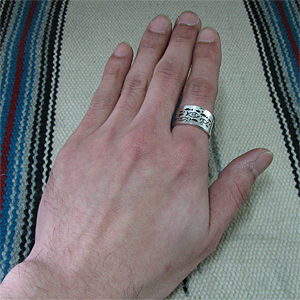 | 個性的なデザインで数々の賞を獲得しているNAVAJO/ナバホ族のトップアーティストの一人 Norbert Peshlakai/ノルバート・ペシュラカイが制作したオーシャンデザインのリングです。 鏡面仕上げで、彼が得意としているスタンプワークが巧みに施されており、まるで絵を描いているような芸術的な仕上がりとなっています。 デザインにはフィッシュ・気泡を用いて、海の中をイメージして制作して頂きました。 ここまでスタンプのクオリティーが高いアーティストは、ナバホ族の中でも数少ないと思います。 ノルバート氏ならではのオリジナリティー溢れるデザインです。 外側に沿った独特の形状で、とても着け心地が気持ち良く優しく感じられます。 | ||