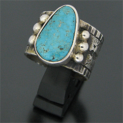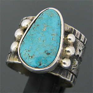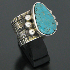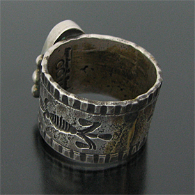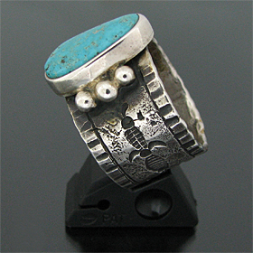 | 数多くの賞を獲得しているNAVAJO/ナバホ族の若手トップアーティストの一人 Lyndon Tsosie/リンドン・ツォーシーが制作したリングです。 素材にはコインシルバー900が用いられています。 鉛のような古い質感を表現したオールドスタイルに、ライトブルーの味わい深いキングマン(ターコイズ)をセットして頂きました。まるでアンティークジュエリーのようで、シンプルで古いスタイルのスタンプワークがより映えます。 リング幅約15mmのRIVER MAIL完全別注の存在感のあるサイズで、幅を広くする事によって、スタンプを全面に強調して頂きました。 完成度の高いインディアンジュエリーが主流になってきているなか、オールドな雰囲気と素朴さを計算しつくした素晴らしい作品に仕上がっています。 男性にお勧めのナバホ族ならではの伝統的なスタイルがしっかりと詰まっている作品です。 使い込むほどに深い味わいをお楽しみ頂ける逸品です。 | ||