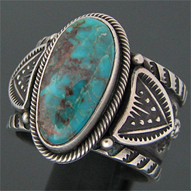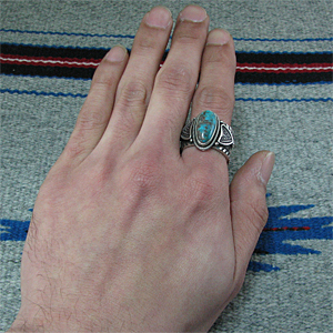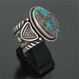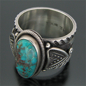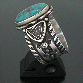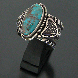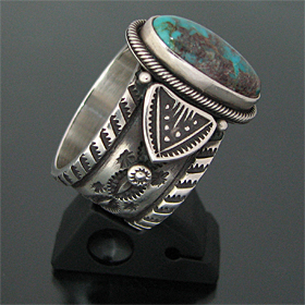 | 賞も獲得している若手人気アーティスト NAVAJO/ナバホ族のIvan Howard/アイバン・ハワードがビズビー(ターコイズ)を用いて制作したリングです。 巧みに施されているスタンプ、そして独特の雰囲気を持つビズビー(ターコイズ)、オールド感を出したアイバンらしい重厚感のあるリングに仕上がっています。 独学でジュエリー作りを学んだアイバンハワード。普段の仕事はエンジニアで、空いた時間をジュエリー制作に費やし、賞を獲得するまでになった注目のアーティストです。 他の仕事をしているため、ジュエリー制作には時間がかかりますが、細部までこだわる彼の作品には目を奪われます。 彼の作品はスタンプから手作りで、オールドスタイルを再現しています。 | ||