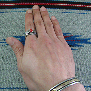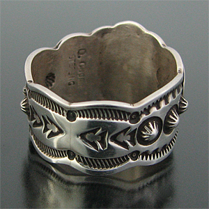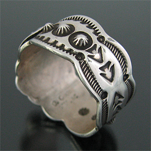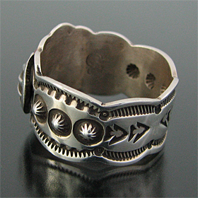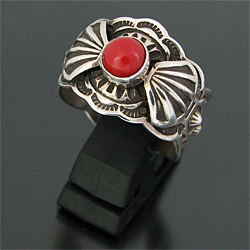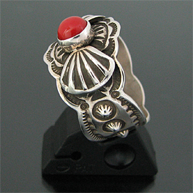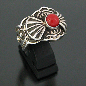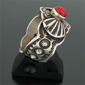 | NAVAJO/ナバホ族の人気アーティスト Darrell Cadman/ダレル・キャドマンが制作したリングです。 彼が得意とする奥深いスタンプワークが巧みに施されており、エンボスという技法で浮き上がらしたアポロコンチョを組み合わせています。 細かな技術がしっかりと強調されている作品で、センターにはコーラル(珊瑚)がセットされています。 重厚感の感じられる作品ですが、コーラルをセットするだけでどこか落ち着いた作品に仕上がっています。 | ||