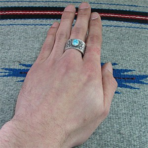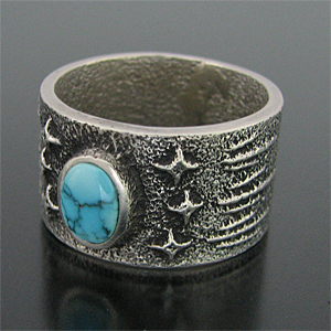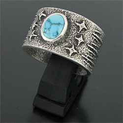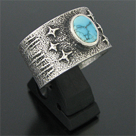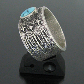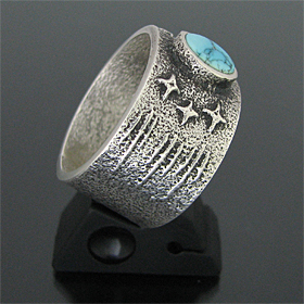 | NAVAJO/ナバホ族のアーティスト Darryl Begay/ダリル・ビゲイに制作を依頼したトゥーファーキャストのリングです。 ベース、そしてベゼルもトゥーファーキャストで仕上げられています。トゥーファーキャストの作品は見た目以上繊細な作りで、機械でのキャストとは違い温かみがあり、柔らかさを感じることが出来ます。 こちらのリングは宇宙をテーマに、地球をナンバーエイト(ターコイズ)で表現して頂き、その周りを流星が流れている様子で制作して頂きました。 こちらはリバーメールのオリジナルデザインになります。 素朴ですが、装着するとどこかホッと落ち着くリングは、優しさと温もりが感じられます。 流行に流されないすっきりとしたシンプルなデザイン、そしてハイグレードのナンバーエイトがセットされている主張しすぎない作り、伝統的な技法を使いつつもニュースタイルを取り入れる、見事な作品です。 | ||