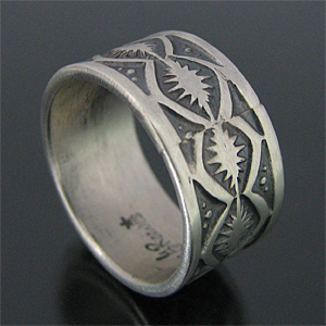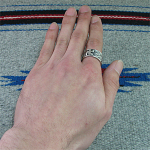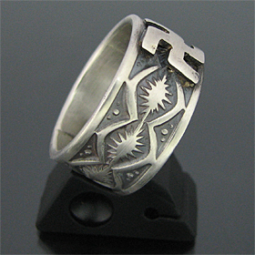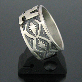 | 国内で圧倒的な人気を誇るNAVAJO/ナバホ族のアーティスト Gary Reeves/ゲーリー・リーブスが制作したリングです。 力強く精巧なスタンプワークは多くのファンから愛され続けているゲーリー・リーブス、今回は彼の技術を存分に発揮して頂けるように、スタンプのみのシンプルで飽きのこないオールドスタイルで表現して頂きました。 デザインは全て彼の独自のセンスから生まれたオリジナルデザインになります。スタンプワークの名手だけあって奥深いスタンプが巧みにリング全体に施されており、その上に幸運の4つのL(Love,Luck,Life,Live)が交わったマーク【スワスティカ】を組み合わせて制作して頂きました。 卍、逆卍共にインディアンもよくデザインしていましたが、ナチスで使用される事になってから、こちらのマークのデザインは使われる事がなくなりました。 1930年代頃まで使用されていたオールドのデザインになります。 弟のSunshine Reeves/サンシャイン・リーブスと共にナバホ族を代表するスタンプワーク技術の持ち主だけあって、センスと技術が巧みに融合された、アンティークな雰囲気が楽しめるリングに仕上がっています。 シンプルでスタイリングしやすく、インディアンジュエリーらしさを感じる事ができる トラディショナルなデザインは、バランス良く仕上がっています。 単体ではもちろん、他のリングとの相性も抜群ですので、マルチにお使い頂けます。 | ||