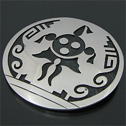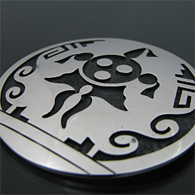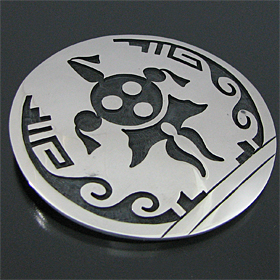 | 数々の賞を受賞し、最も名誉ある【Arizona Living Treasure/アリゾナ州の無形文化財、日本でいう人間国宝】の称号をもつHOPI/ホピ族のベテラン有名アーティスト Griselda Saufkie/グリセルダー・スフキーがデザインしたペンダント/ブローチです。 近年ではこのようなホピ族のオールドな雰囲気をもつ作品はあまり見られなくなりました。 モチーフは【Mud Head/マッド・ヘッド】がオーバーレイによってデザインされています。マッド・ヘッドは儀式での役割は司会者、ドラマー、ダンサー、コメディアン等をこなすエンターテナーで、クラウンと同様に儀式の雰囲気を和ませたり、滞る事無く進行させる重要な仕事をこなします。 とても味わい深い作品で、ホピ族の作品が好きな方には特にお勧めです。 存在感のある大きさで、ペンダントの他にブローチにもお使い頂けます。 味わい深い作品をどうぞお楽しみ下さい。 こちらはローレンスの熊と、グリセルダーの雪雲のダブルホールマークとなります。ご夫婦のダブルホールマークは貴重なアイテムで、今後入荷出来るかは未定です。 | ||