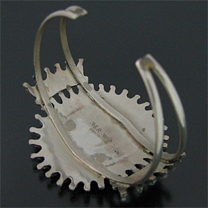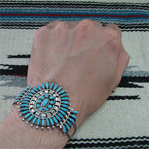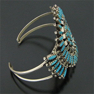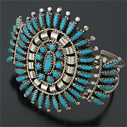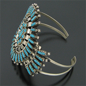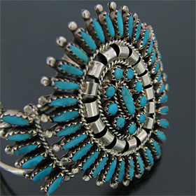 | ZUNI/ズニ族がニードルポイント技法を用いて制作したバングルです。 石や貝殻を針のように細くカットして花びらのようにアレンジする技法、『ニードルポイント』を用いて制作されています。 トラディショナルなデザインで、大変人気のあるインディアンジュエリーらしさが詰まった作品です。 圧倒的な存在感をお楽しみ頂けるアイテムで、様々なファッション誌、テレビ等で有名人が着けているのをよく見かけます。 爽やかさが全面に強調されており、技術&ファッション性と共に高いレベルです。 ※サイズは多少変更が出来ますのでお気軽にお問い合わせくださいませ。 | ||