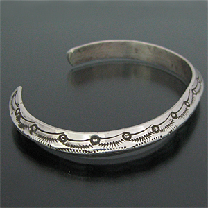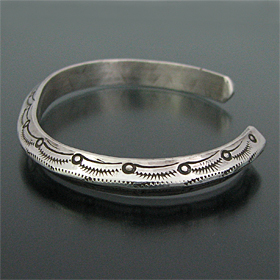 | TAOS/タオス プエブロの有名アーティスト Sonny Spruce/ソニー・スプルースの代表作、三角ワイヤーを使用したバングルです。 ソニーが得意とするスタンプワークが施されている、とてもシンプルでスタイリングしやすい作品です。 ベーシックなデザインですが、男女問わずスタイルを選ばず、どんな場面でも活躍してくれます。 重ね着けにもお勧めで、シンプルに単体でお使い頂くのにも重宝します。 10数年前から作風は変わらず、オールドスタイルという枠にピッタリとはまるソニーの作品には、どこか安心感を感じます。 | ||