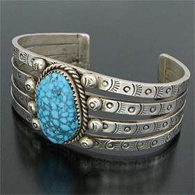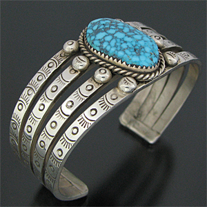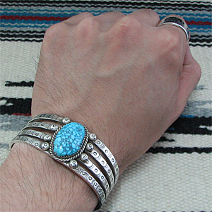 | TAOS/タオス プエブロの有名アーティスト Sonny Spruce/ソニー・スプルースの代表作、スクエアワイヤーを使用したバングルです。 大胆にキングマン(ターコイズ)が使用されている、ソニー・スプルースの味わい深い作品です。 4本のスクエアワイヤーには、巧みにスタンプワークが施されており、圧倒的な存在感と共に、ウェブがとても美しく浮き出ているキングマンを惜しみなく使用しています。 ベーシックなデザインですが、男女問わずスタイルを選ばず、どんな場面でも活躍してくれます。 10数年前から作風は変わらず、オールドスタイルという枠にピッタリとはまるソニーの作品には、どこか安心感を感じます。 ※サイズは多少変更が出来ますので、お気軽にお問い合わせくださいませ。 | ||