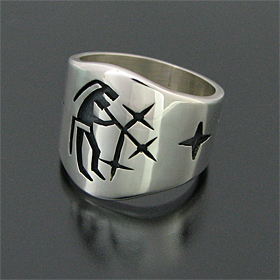 | HOPI/ホピ族の有名アーティスト Ricky Coochwytewa/リッキー・クーチュワイテワに制作依頼をしたリングです。 オーバーレイ技法を用いて、【スターブロワーズ】がデザインされています。 こちらは偉大な父親であるヴィクターから継承されているデザインで、ヴィクターは1994年にアリゾナ州の人間国宝にも選ばれていますが、残念ながら2011年6月に永眠しました。 自身でデザインした作品と共に、近年特に父親のヴィクターのデザインを使用した作品を制作されています。 当店はリッキーと深い親交があるため、スターブロワーズの金型を譲って頂いています。 こちらの金型は店頭のみでご紹介させて頂いております。 センターに星に息を吹き込むスターブロワーズ、両サイドには新たに星が生まれている様子がデザインされています。 | ||