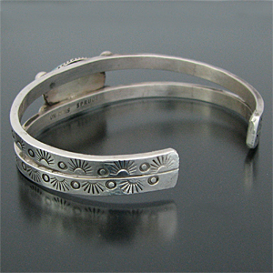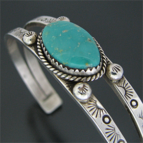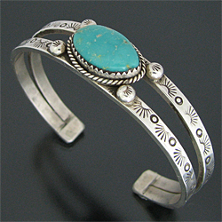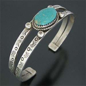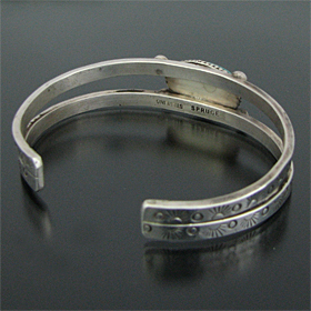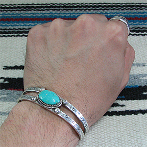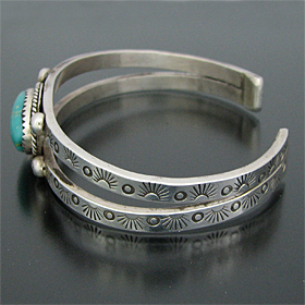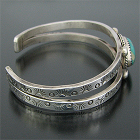 | TAOS/タオス プエブロの有名アーティスト Sonny Spruce/ソニー・スプルースの代表作、スクエアワイヤーを使用したバングルです。 大胆にターコイズが使用されている、ソニー・スプルースの味わい深い作品です。 2本のスクエアワイヤーには、巧みにスタンプワークが施されており、伝統を伝える素朴な力強さと共に、気品さが伝わってきます。 ベーシックなデザインですが、男女問わずスタイルを選ばず、どんな場面でも活躍してくれます。 現在も作風は変わらず、オールドスタイルという枠にピッタリとはまるソニーの作品には、どこか安心感を感じます。 サイズ調整も可能ですので、お気軽にご相談ください。 | ||
