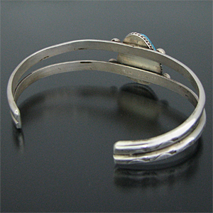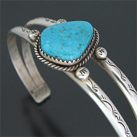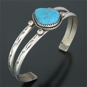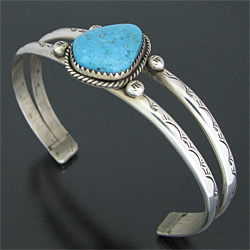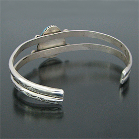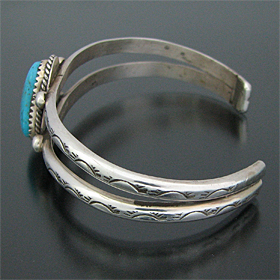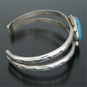 | TAOS/タオス プエブロの有名アーティスト Sonny Spruce/ソニー・スプルースの代表作、甲丸ワイヤーを使用したバングルです。 大胆にターコイズが使用されている、ソニー・スプルースの味わい深い作品です。 2本のスクエアワイヤーには、巧みにスタンプワークが施されており、伝統を伝える素朴な力強さと共に、気品さが伝わってきます。 ベーシックなデザインですが、男女問わずスタイルを選ばず、どんな場面でも活躍してくれます。 現在も作風は変わらず、オールドスタイルという枠にピッタリとはまるソニーの作品には、どこか安心感を感じます。 サイズ調整も可能ですので、お気軽にご相談ください。 | ||