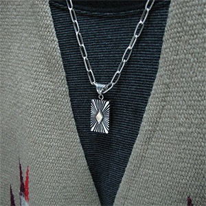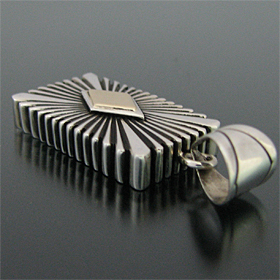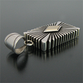 | NAVAJO/ナバホ族の有名アーティスト Patricia Bedonie/パトリシア(パット)・べドニーに制作依頼をしたペンダントです。 彼女の代表的デザインのサンバースト(太陽光線)をモチーフに、14K&シルバーを使用したヘビーゲージのペンダントです。 中心部分がシルバーと14Kのダブルダイヤモンドになっています。 重厚感があり、サイズ以上に存在感を得られる作品に仕上がりました。厚みを出すことによって、スタンプがさらに奥深く表現でき、高級感を損なわず、妥協のない綺麗な作品です。 正確で丁寧且つシャープなスタンプワークは、女性がスタンプしたとは思えない様な力強いスタンプですが、女性アーティストだからできる繊細さも持ち合わせた作品です。 洗練されたデザインですが、ナバホ族の伝統的なデザインです。 ホピチェーン・ナバホチェーンと組み合わせるのがお勧めです。 | ||